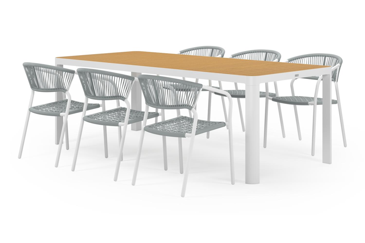 Ellara tuinset verzoent strakke en speelse lijnen. Het tafelblad heeft een rechthoekige vorm met afgeronde hoeken. Het tafelframe is fijn afgewerkt met ronde tafelpoten.