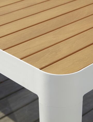 Een tafelblad uit polywood heeft de look van hout, maar is eigenlijk kunststof. Je geniet van de charmante uitstraling van hout, maar het barst of scheurt niet en behoudt jarenlang zijn unieke bruine houtlook. Opgelet: polywood is een synthetisch materiaal dat niet resistent is tegen hitte. Warmte - denk aan zonlicht dat door glazen schijnt - kan het materiaal beschadigen. Gebruik dus altijd een onderzetter of dienblad wanneer je glaswerk op je meubel plaatst.
