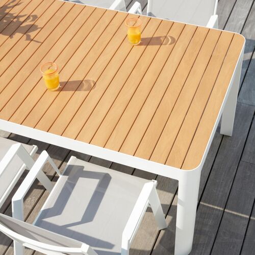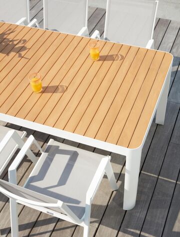Een tafelblad uit polywood heeft de look van hout, maar is eigenlijk kunststof. Je geniet van de charmante uitstraling van hout, maar het barst of scheurt niet en behoudt jarenlang zijn unieke bruine houtlook. Opgelet: polywood is een synthetisch materiaal dat niet resistent is tegen hitte. Warmte - denk aan zonlicht dat door glazen schijnt - kan het materiaal beschadigen. Gebruik dus altijd een onderzetter of dienblad wanneer je glaswerk op je meubel plaatst.