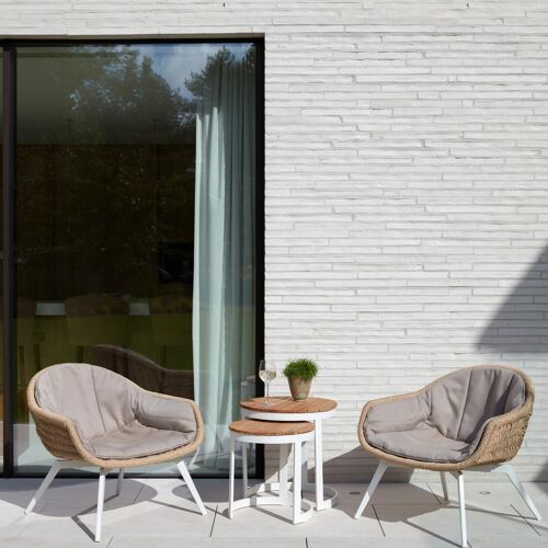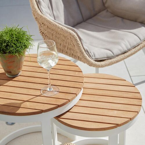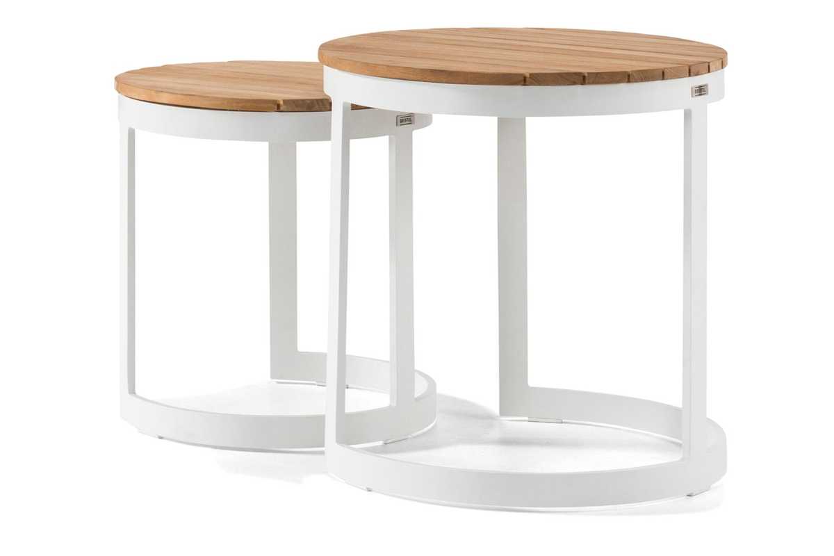 De set van twee ronde Enna bijzettafels is een perfecte aanvulling op jouw lounge. De tafels zijn gemaakt van hoogwaardig, roestvrij aluminium en afgewerkt met een tafelblad in teak. Je kan ze individueel gebruiken, maar ook gecombineerd in set. Je kan de kleine tafel volledig onder de tafel schuiven.