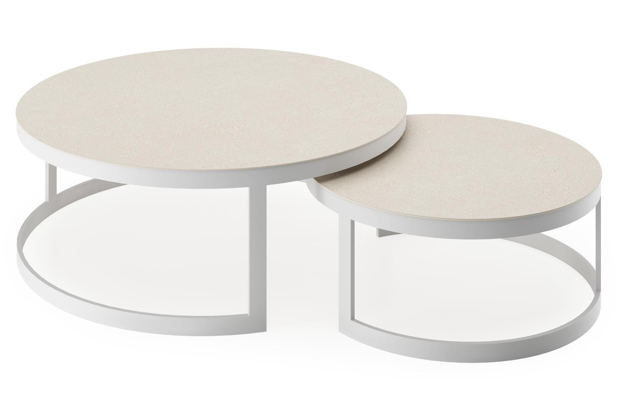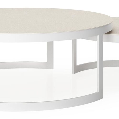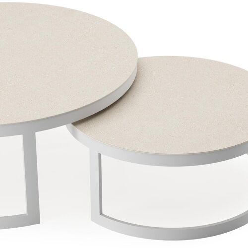 Enna set van 2 loungetafels in wit aluminium en Beige volkeramiek - Dia. 100/70 x H 37/30 cm | Exterioo
