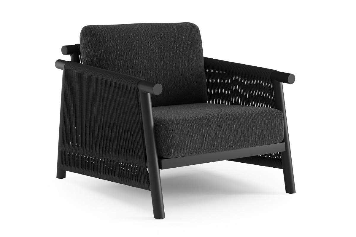 Erla loungestoel in zwart aluminium en zwart verticaal geweven ronde rope met zwart kussen | Exterioo