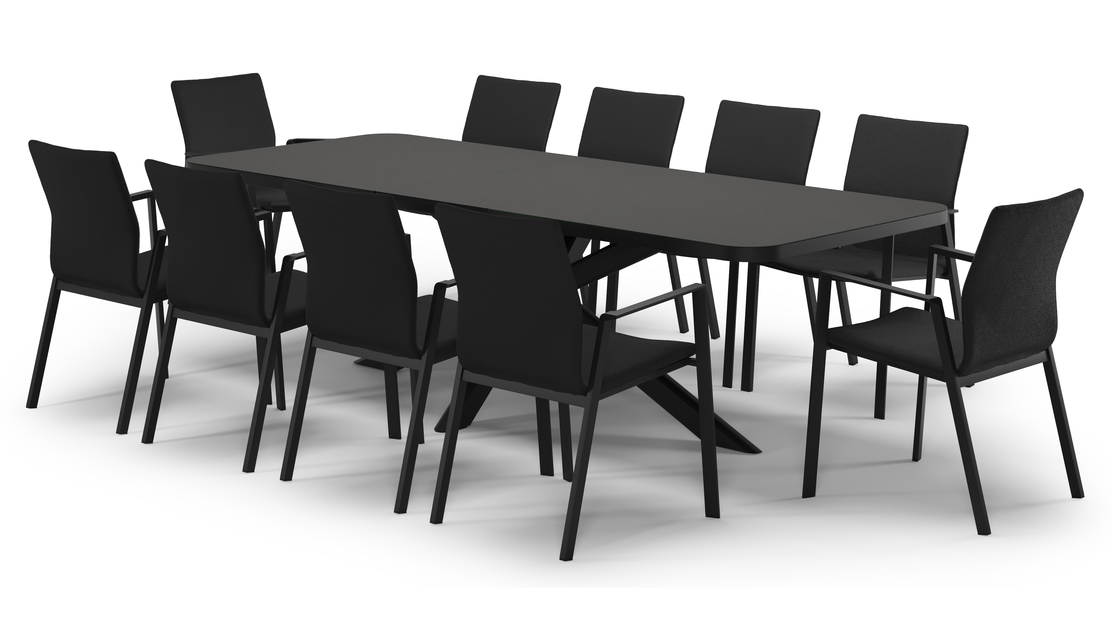 De Estella tuinset valt op door haar dynamische onderstel met kruispoten, wat zorgt voor een krachtig en modern design. Dankzij het uitschuifbare systeem creëer je in een handomdraai extra plaats aan tuinset wanneer je gasten ontvangt. Het frame van de tuintafel is gemaakt uit roestvrij aluminium, een sterk maar toch licht materiaal dat makkelijk verplaatsbaar is. Het oppervlak is glad afgewerkt waardoor het geen vuil aantrekt en onderhoudsvriendelijk is. De poedercoating zorgt voor de UV- en weerbestendigheid van je meubel. Een sintered stone tafelblad bevat verschillende soorten mineralen die op een nog hogere druk worden gebakken dan keramiek, maar toch dezelfde eigenschappen heeft. Het materiaal is uiterst stevig. Het is vorst-, hitte- en krasbestendig en eenvoudig schoon te maken.
