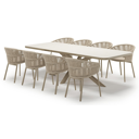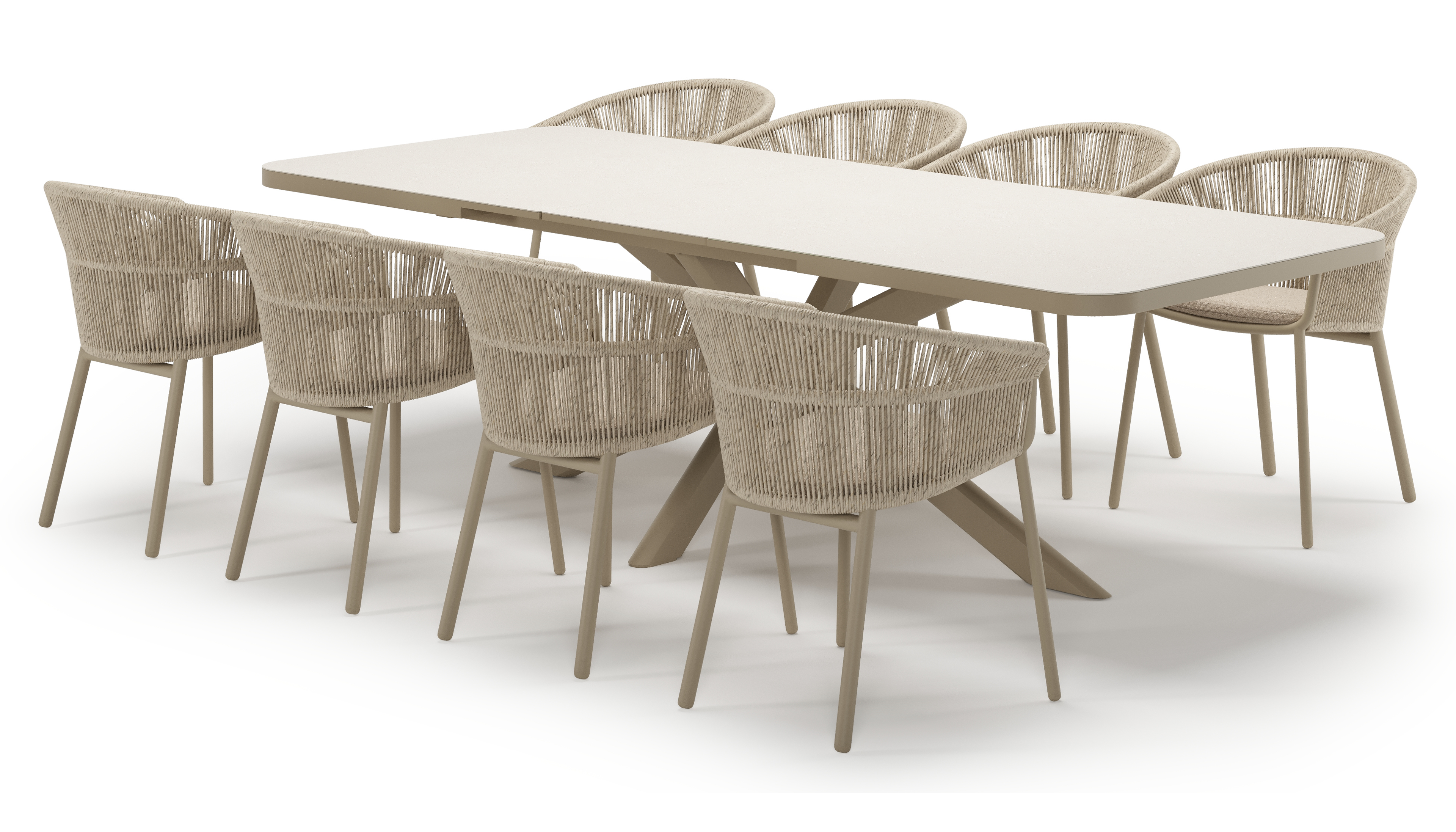 De Estella tuinset valt op door haar dynamische onderstel met kruispoten, wat zorgt voor een krachtig en modern design. Dankzij het uitschuifbare systeem creëer je in een handomdraai extra plaats aan tuinset wanneer je gasten ontvangt. Het frame van de tuintafel is gemaakt uit roestvrij aluminium, een sterk maar toch licht materiaal dat makkelijk verplaatsbaar is. Het oppervlak is glad afgewerkt waardoor het geen vuil aantrekt en onderhoudsvriendelijk is. De poedercoating zorgt voor de UV- en weerbestendigheid van je meubel. Een sintered stone tafelblad bevat verschillende soorten mineralen die op een nog hogere druk worden gebakken dan keramiek, maar toch dezelfde eigenschappen heeft. Het materiaal is uiterst stevig. Het is vorst-, hitte- en krasbestendig en eenvoudig schoon te maken.