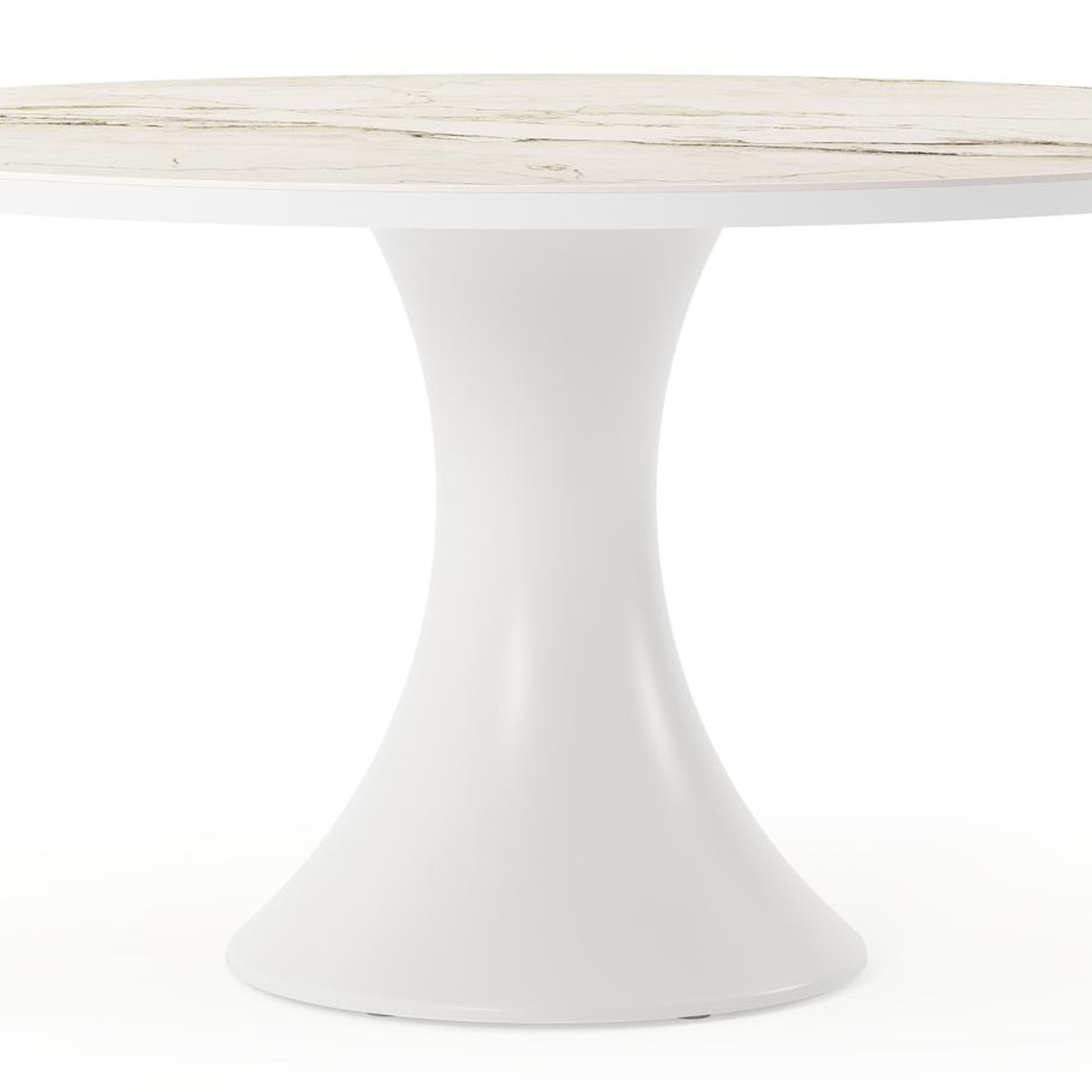 De Fano collectie onderscheidt zich door zijn trendy ronde tafel met de kenmerkende trompetpoot. Deze eigentijdse tafel biedt niet alleen een modieuze uitstraling, maar creëert ook een gezellige tafelbeleving, waarbij mensen tegenover elkaar kunnen zitten.
