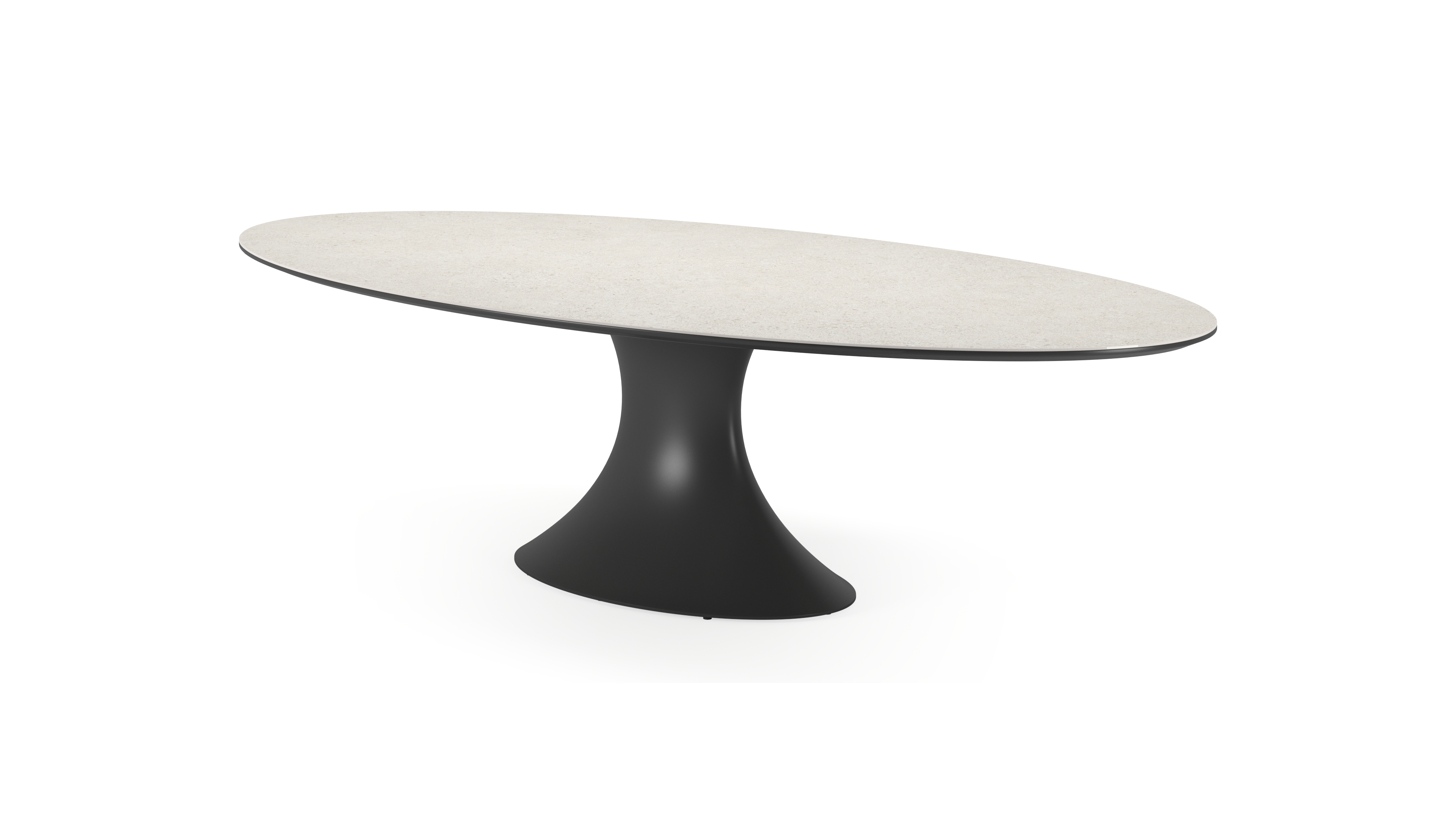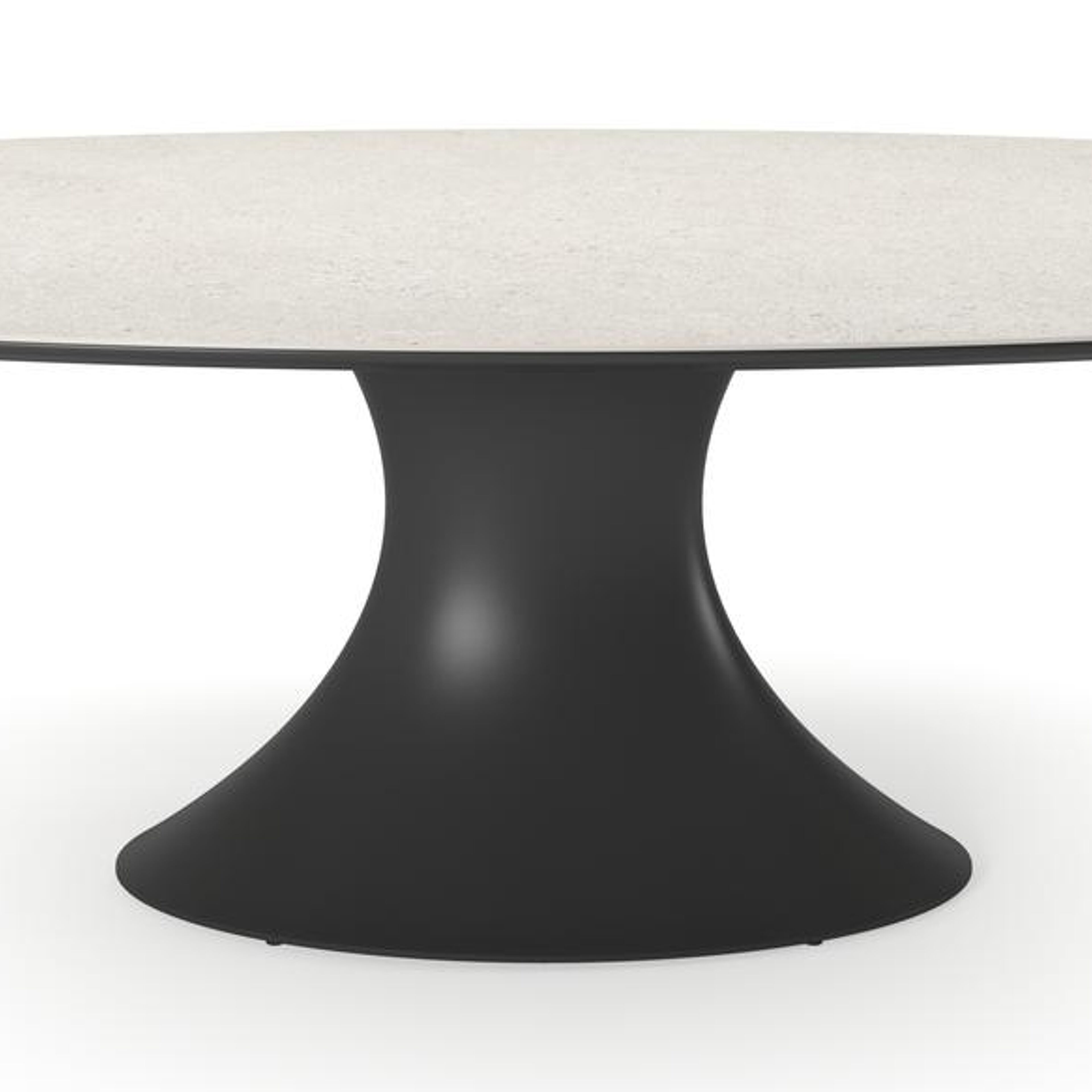De ronde Fano tafel is een trendy tafel dankzij zijn typische trompetpoot. Bovendien heb je aan een ronde tafel een gezellige tafelbeleving omdat je tegenover elkaar kunt zitten. Het frame is gemaakt van aluminium een licht, maar sterk en roestvrij materiaal dat zeer geschikt is voor tuinmeubelen. Deze tafel is afgewerkt met een Shilin tafelblad. Dit is een nieuwkomer in ons assortiment. De aardse kleurschakeringen passen perfect aan bij onze nieuwe outdoortrends. In het tafelblad is er een licht reliëf te voelen, waardoor het Shilin blad de look & feel heeft van echte natuursteen. In het blad is een fijne glinster aanwezig. Het voordeel van volkeramische tafelbladen is dat ze krasbestendig zijn en bestand zijn tegen alle weersomstandigheden.