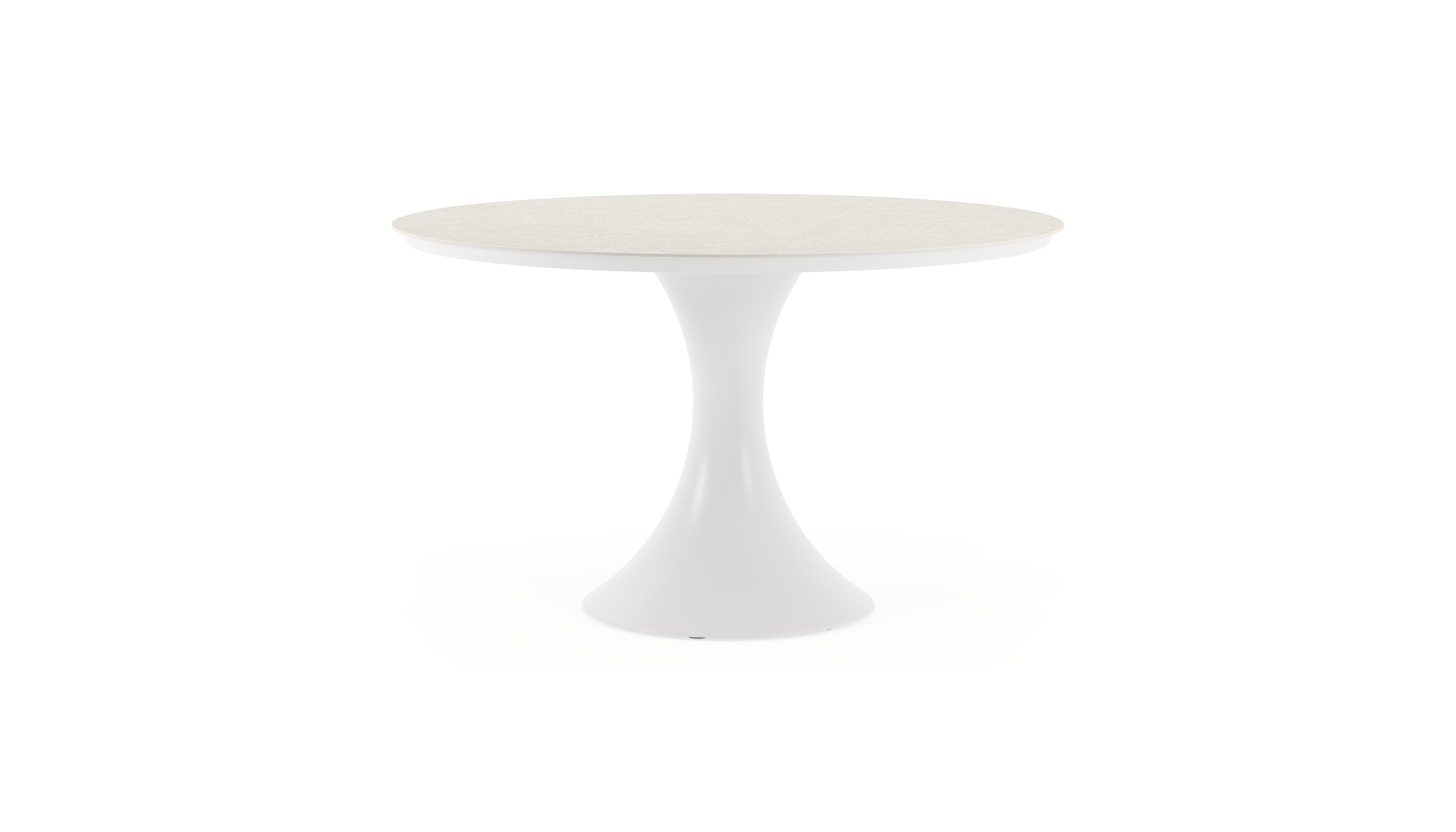 De ronde Fano tafel is een trendy tafel dankzij zijn typische trompetpoot. Bovendien heb je aan een ronde tafel een gezellige tafelbeleving omdat je tegenover elkaar kunt zitten. Het frame is gemaakt van aluminium een licht, maar sterk en roestvrij materiaal dat zeer geschikt is voor tuinmeubelen. Deze tafel is afgewerkt met een Shilin tafelblad. Dit is een nieuwkomer in ons assortiment. De aardse kleurschakeringen passen perfect aan bij onze nieuwe outdoortrends. In het tafelblad is er een licht reliëf te voelen, waardoor het Shilin blad de look & feel heeft van echte natuursteen. In het blad is een fijne glinster aanwezig. Het voordeel van volkeramische tafelbladen is dat ze krasbestendig zijn en bestand zijn tegen alle weersomstandigheden.