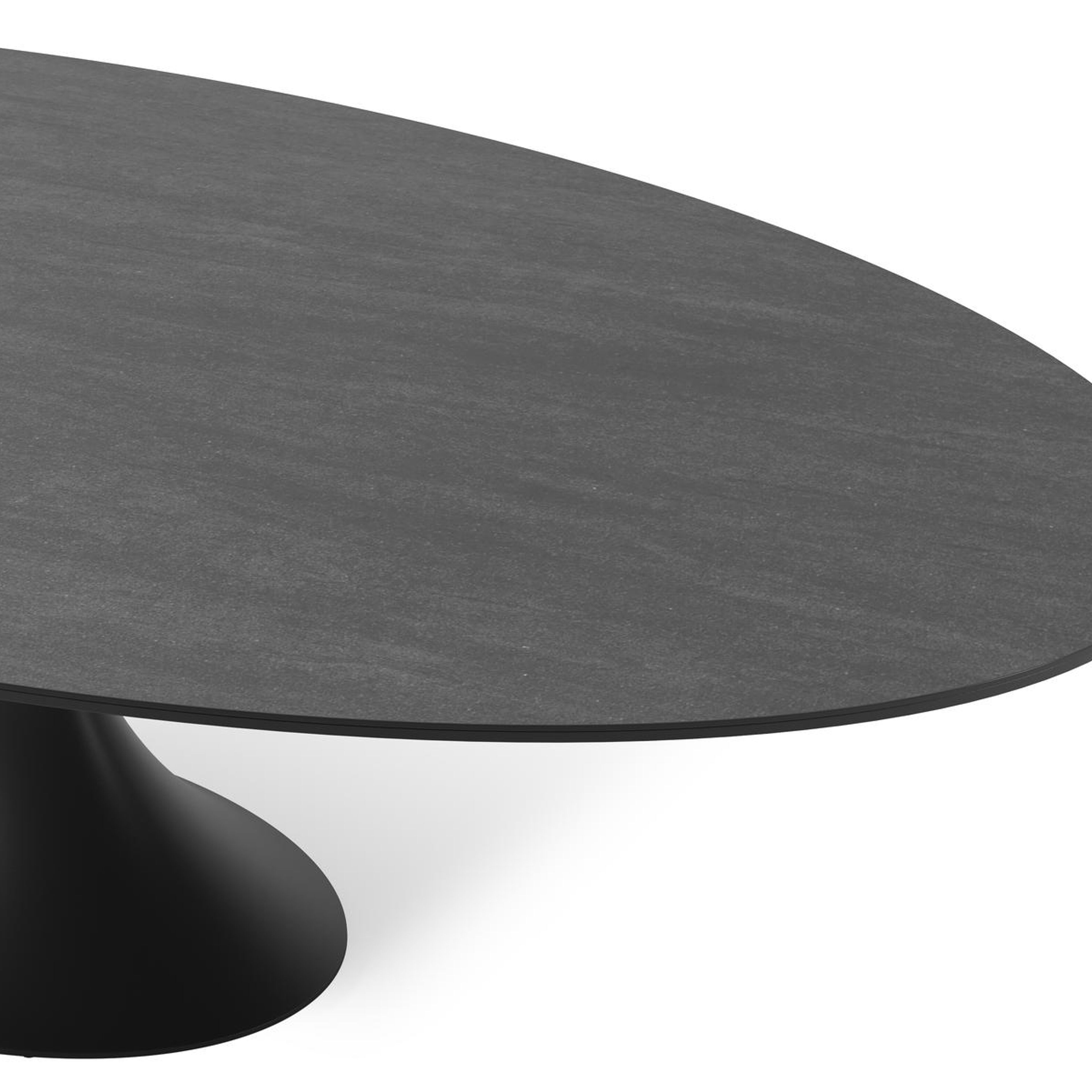 De ovale Fano heeft een centrale, typische stijlvolle poot. Het frame is gemaakt van aluminium een licht, maar sterk en roestvrij materiaal dat zeer geschikt is voor tuinmeubelen. Deze tafel is afgewerkt met een Basalt Black tafelblad. Die is geïnspireerd op de basaltsteen, een grijszwart vulkanisch stollingsgesteente. Het voordeel van volkeramische tafelbladen is dat ze krasbestendig zijn en bestand zijn tegen alle weersomstandigheden.