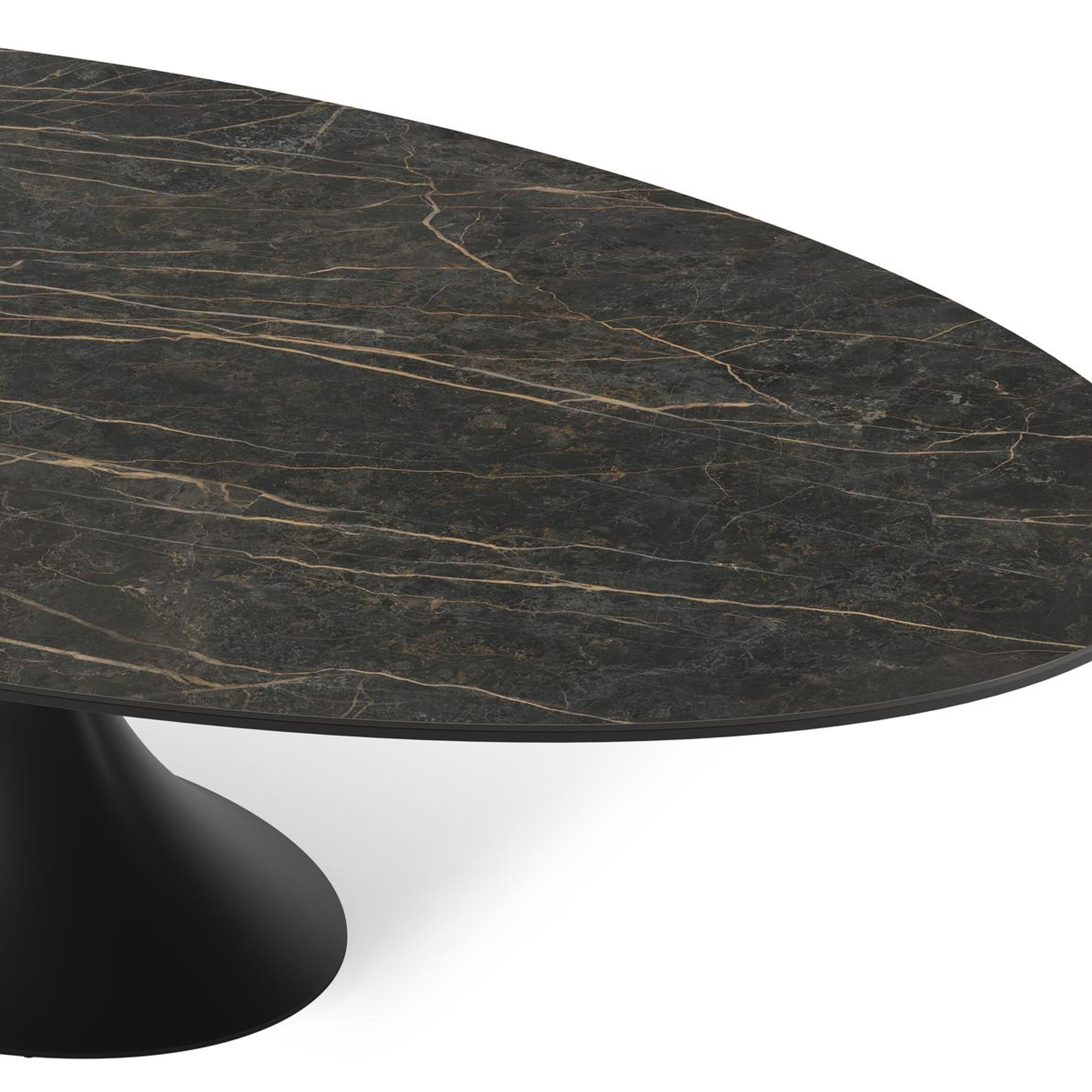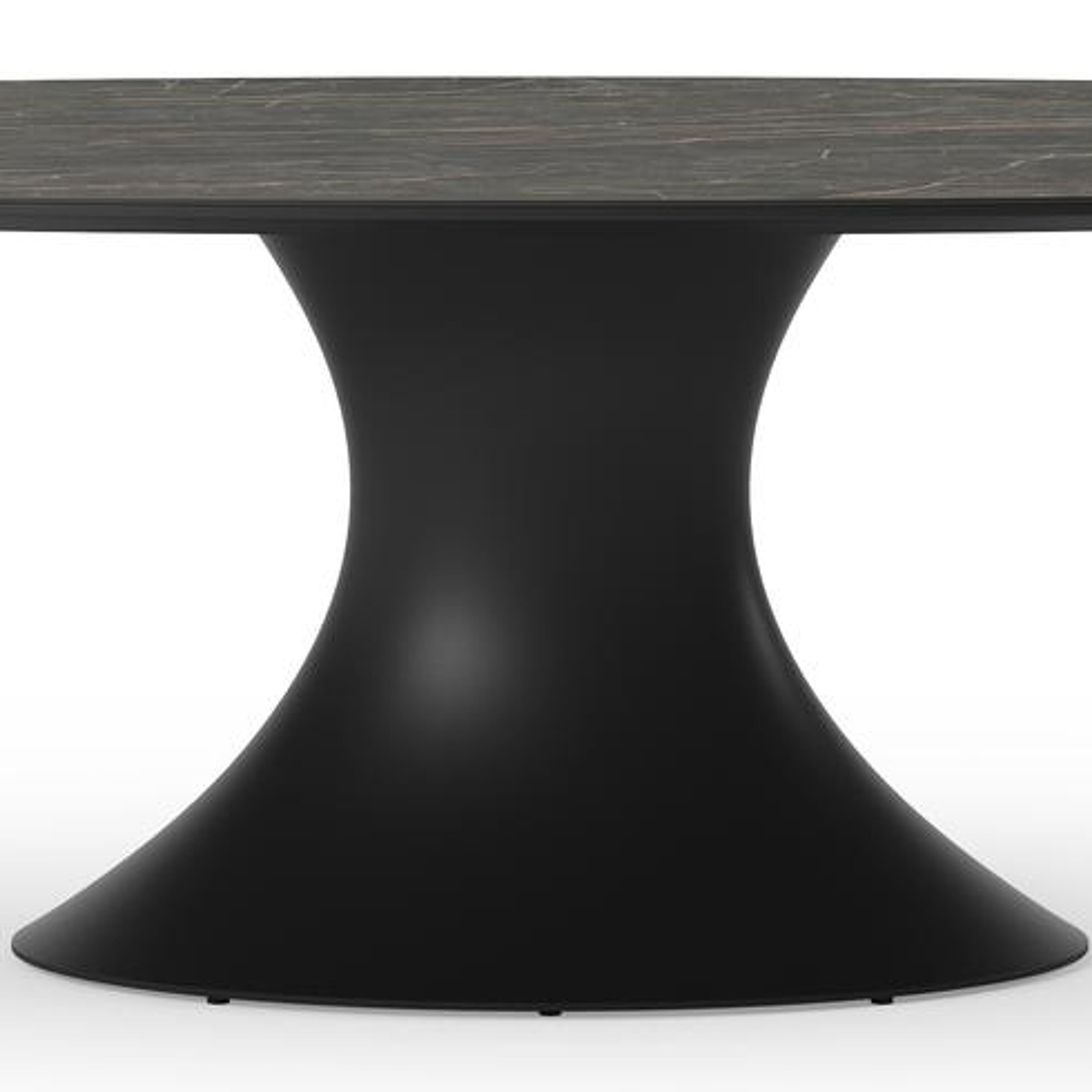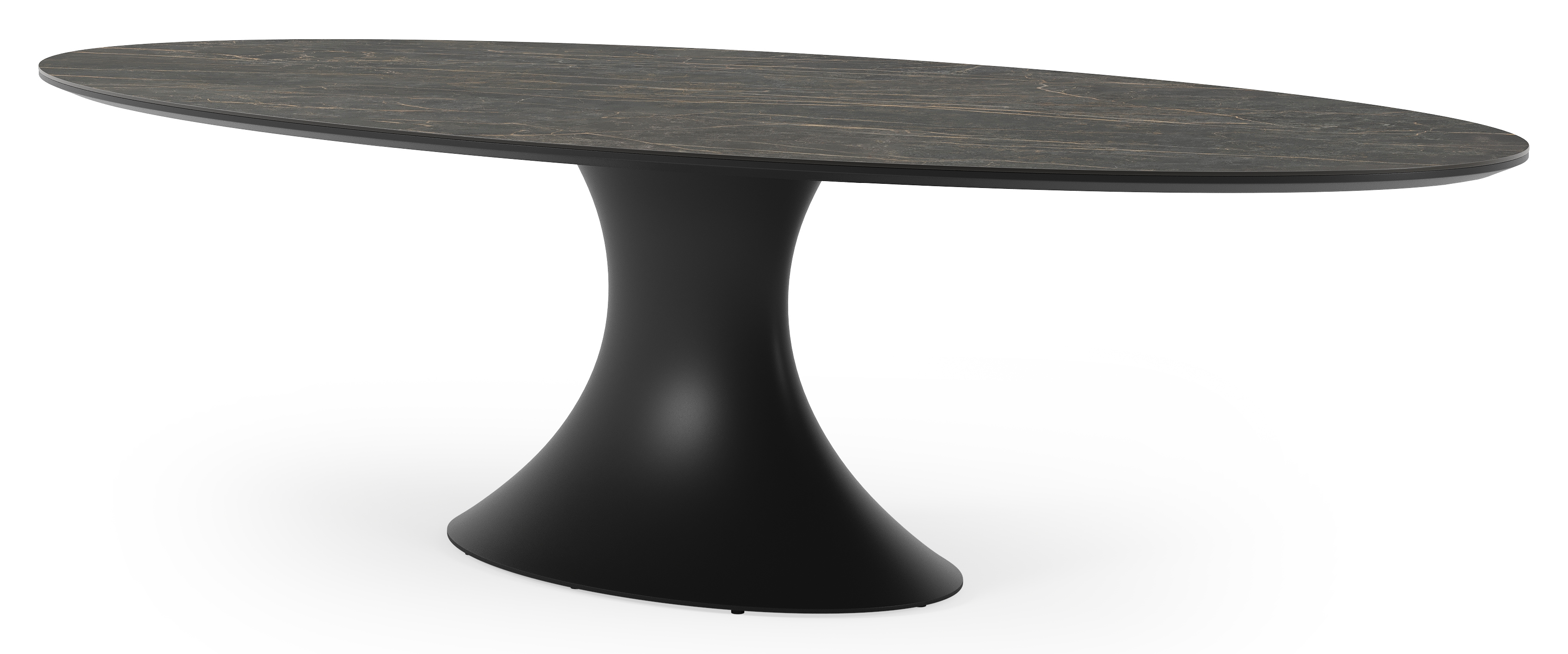 De ovale Fano heeft een centrale, typische stijlvolle poot. Het frame is gemaakt van aluminium een licht, maar sterk en roestvrij materiaal dat zeer geschikt is voor tuinmeubelen. Deze tafel is afgewerkt met een Black Obsession tafelblad. Een echte eyecatcher voor wie het graag iets luxueuzer heeft. De ondergrond van het blad is zwart maar is afgewerkt met een goudgele aders die een prachtige marmerlook creëren. Het voordeel van volkeramische tafelbladen is dat ze krasbestendig zijn en bestand zijn tegen alle weersomstandigheden.