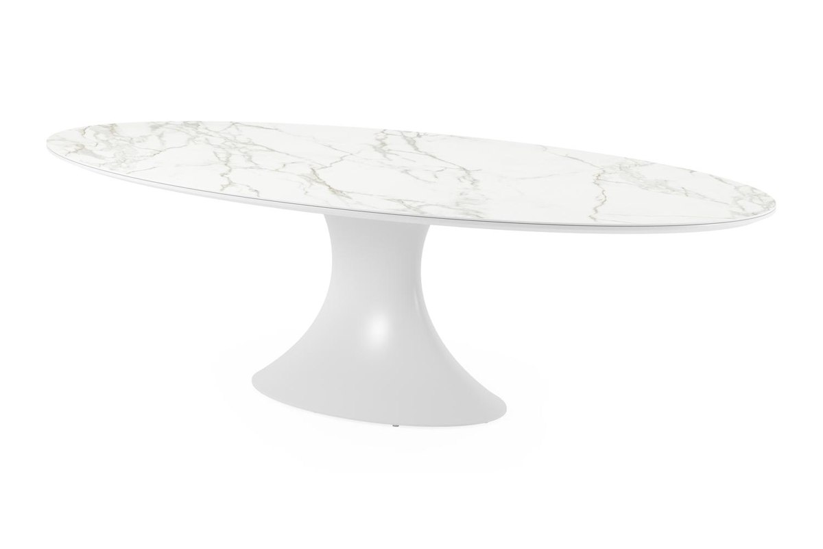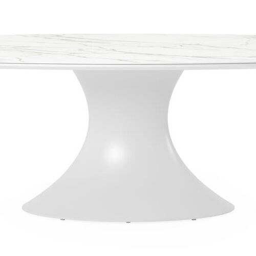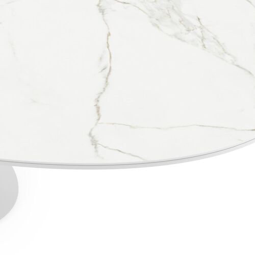 De ovale Fano heeft een centrale, typische stijlvolle poot. Het frame is gemaakt van aluminium een licht, maar sterk en roestvrij materiaal dat zeer geschikt is voor tuinmeubelen. Deze tafel is afgewerkt met een Calacatta tafelblad. De basis van het blad is wit, maar is afgewerkt met grijze aders die een prachtige marmerlook creëren. Het voordeel van volkeramische tafelbladen is dat ze krasbestendig zijn en bestand zijn tegen alle weersomstandigheden.
