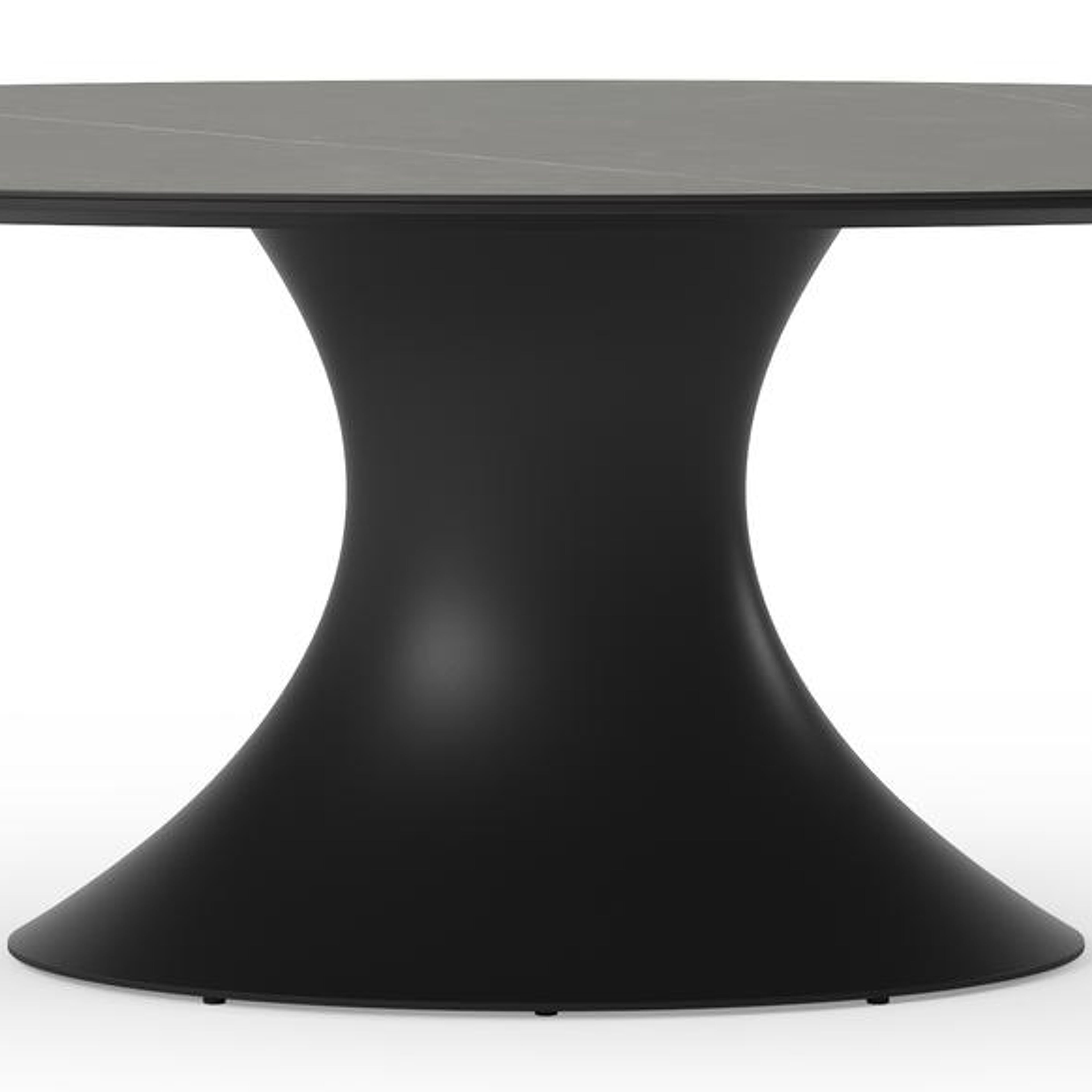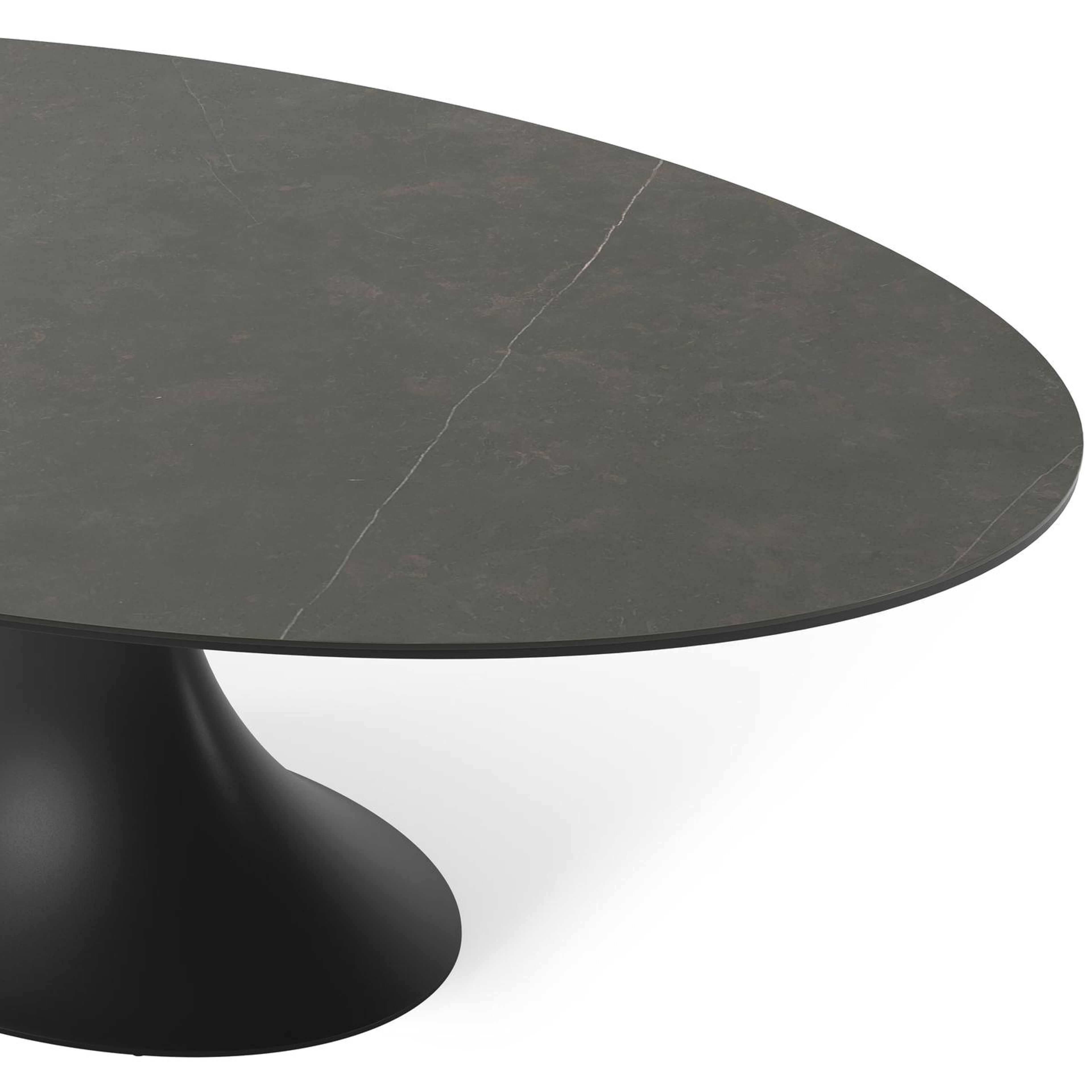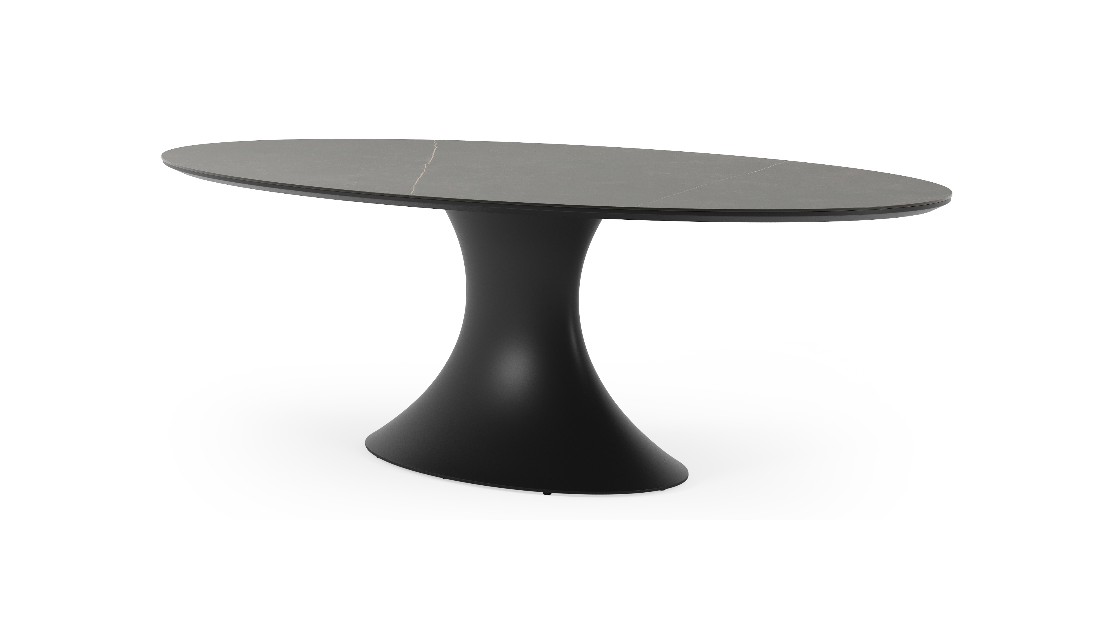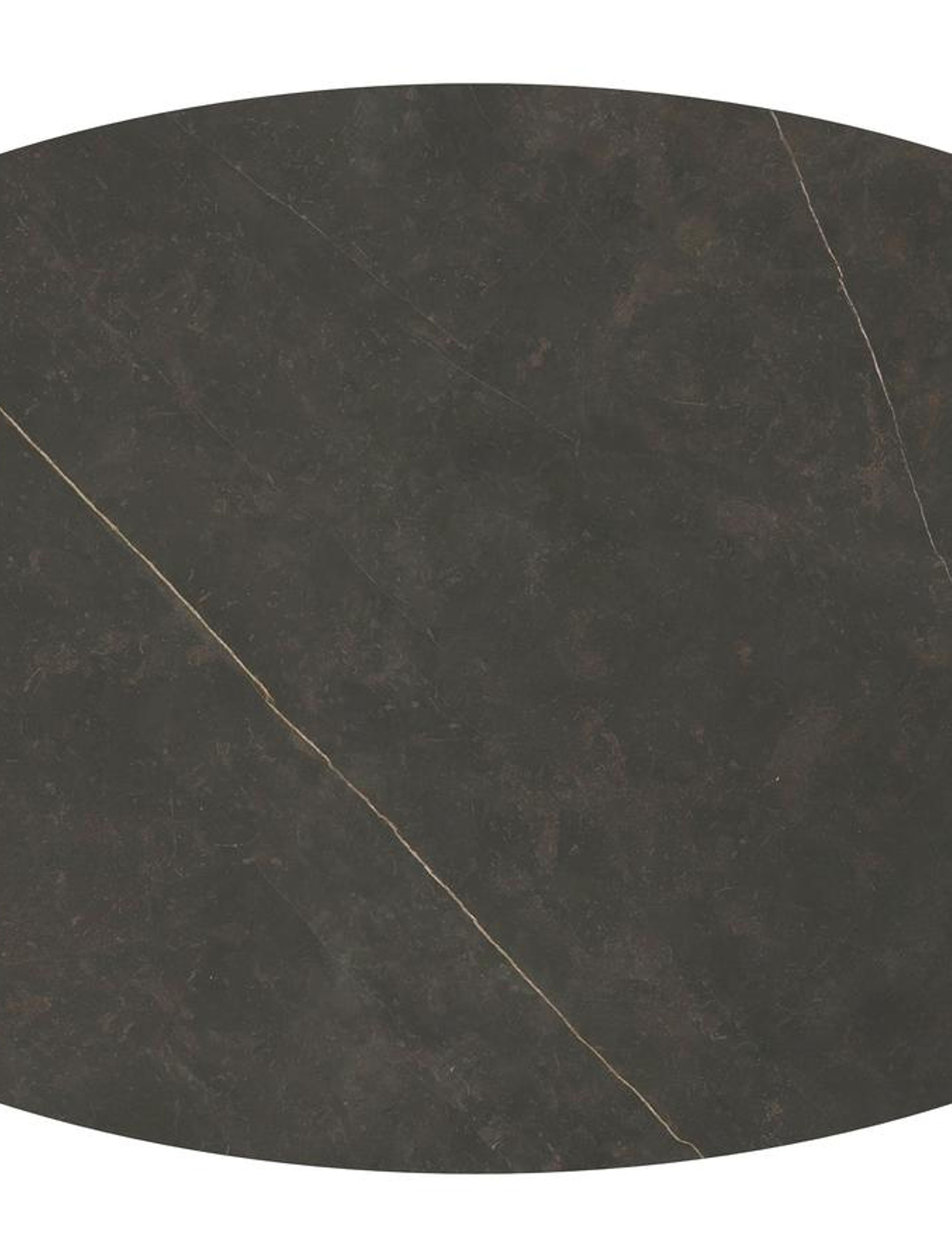 De ovale Fano heeft een centrale, typische stijlvolle poot. Het frame is gemaakt van aluminium een licht, maar sterk en roestvrij materiaal dat zeer geschikt is voor tuinmeubelen. Deze tafel is afgewerkt met een Calatorao tafelblad. Die is geïnspireerd op een grijze kalksteen. Het blad heeft rustige marmerlook dankzij de gouden aders op de donkergrijze kleurschakeringen. Het voordeel van volkeramische tafelbladen is dat ze krasbestendig zijn en bestand zijn tegen alle weersomstandigheden.