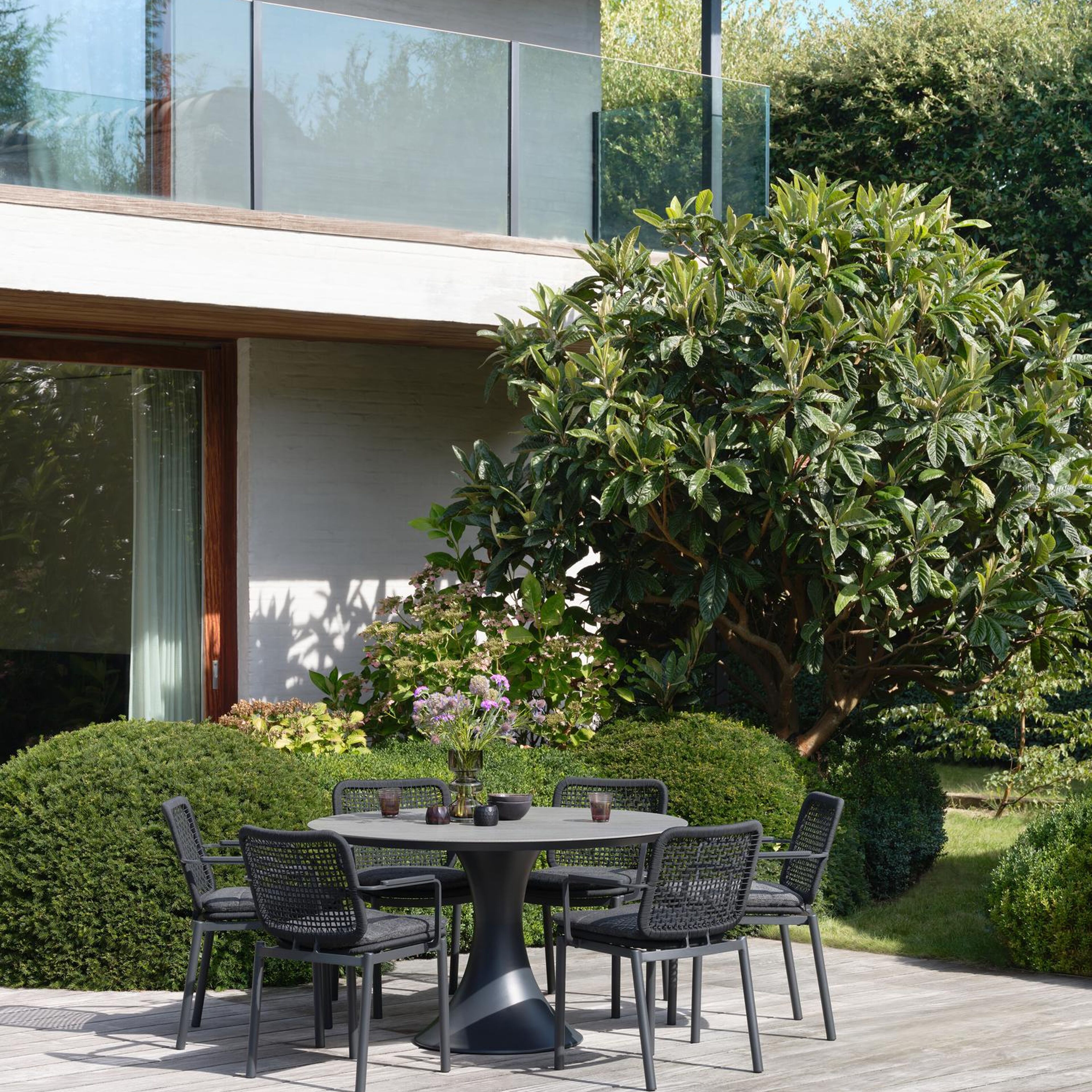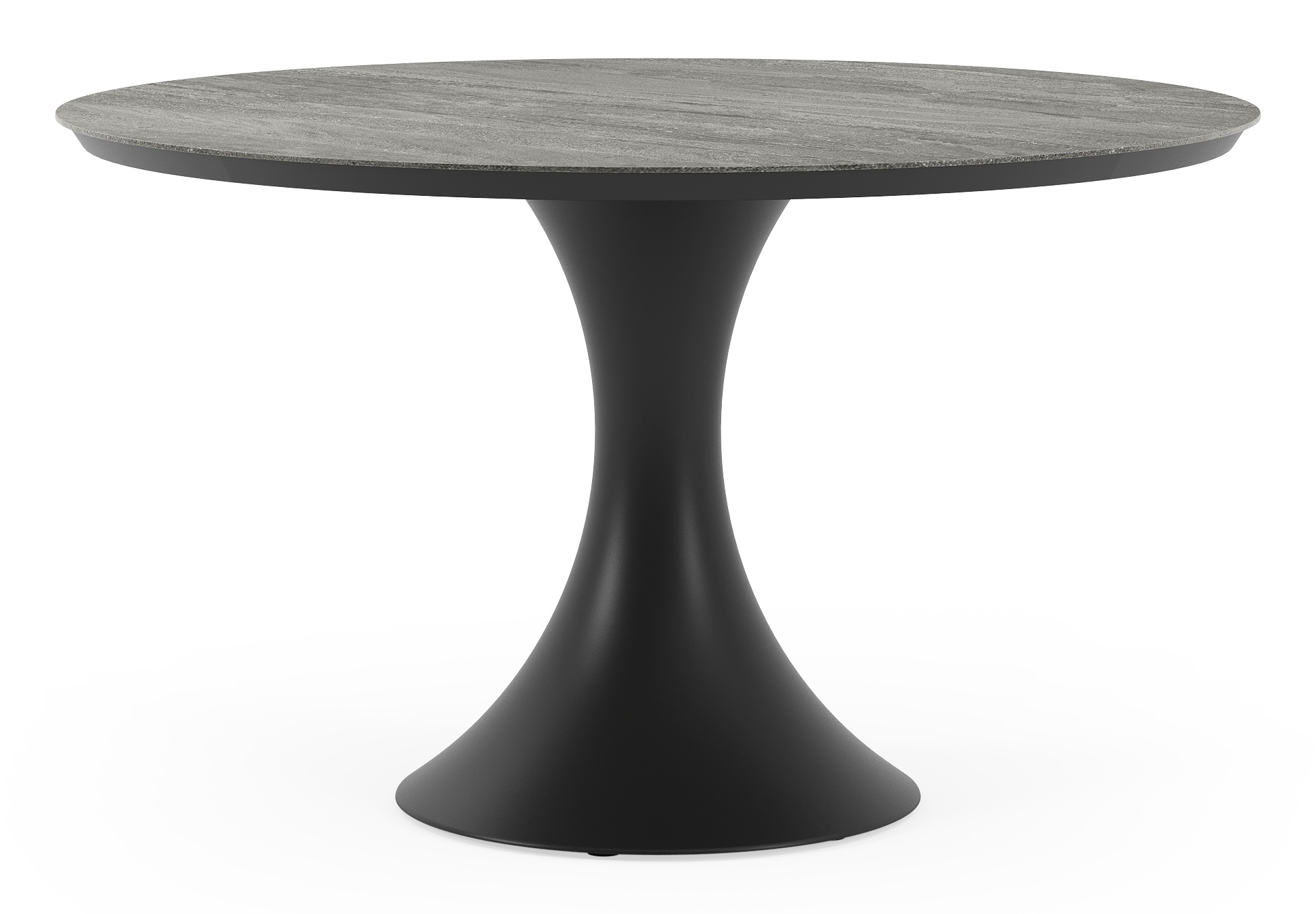 De ronde Fano tafel is een trendy tafel dankzij zijn typische trompetpoot. Bovendien heb je aan een ronde tafel een gezellige tafelbeleving omdat je tegenover elkaar kunt zitten. Het frame is gemaakt van aluminium een licht, maar sterk en roestvrij materiaal dat zeer geschikt is voor tuinmeubelen. Deze tafel is afgewerkt met een Aspen Grey tafelblad. Het Aspen grey tafelblad is een mat tafelblad met grijszwarte kleurschakeringen. Het voordeel van volkeramische tafelbladen is dat ze krasbestendig zijn en bestand zijn tegen alle weersomstandigheden.