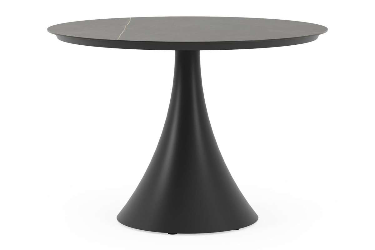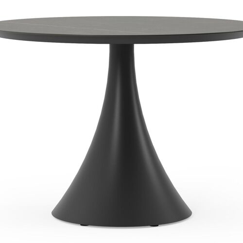 De ronde Fano tafel is een trendy tafel dankzij zijn typische trompetpoot. Bovendien heb je aan een ronde tafel een gezellige tafelbeleving omdat je tegenover elkaar kunt zitten. Het frame is gemaakt van aluminium een licht, maar sterk en roestvrij materiaal dat zeer geschikt is voor tuinmeubelen. Deze tafel is afgewerkt met een Calatorao tafelblad. Die is geïnspireerd op een grijze kalksteen. Het blad heeft rustige marmerlook dankzij de gouden aders op de donkergrijze kleurschakeringen. Het voordeel van volkeramische tafelbladen is dat ze krasbestendig zijn en bestand zijn tegen alle weersomstandigheden.