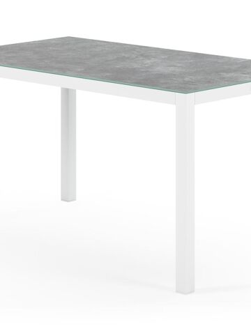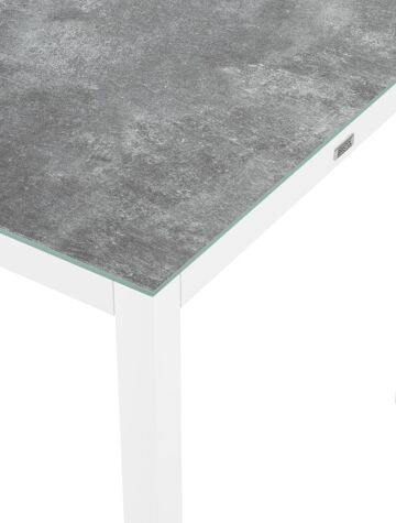 Een tafelblad uit keramisch glas bestaat uit een glazen oppervlak waarop een keramische laag gebakken wordt. Je krijgt zo de look van een volkeramisch blad op het glas. Dankzij de keramische laag is het tafelblad krasbestendig en eenvoudig schoon te maken.