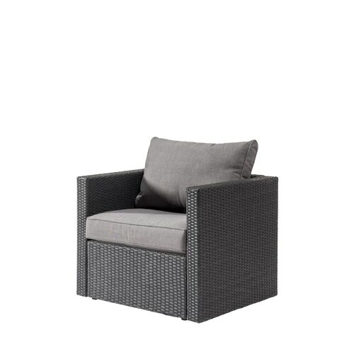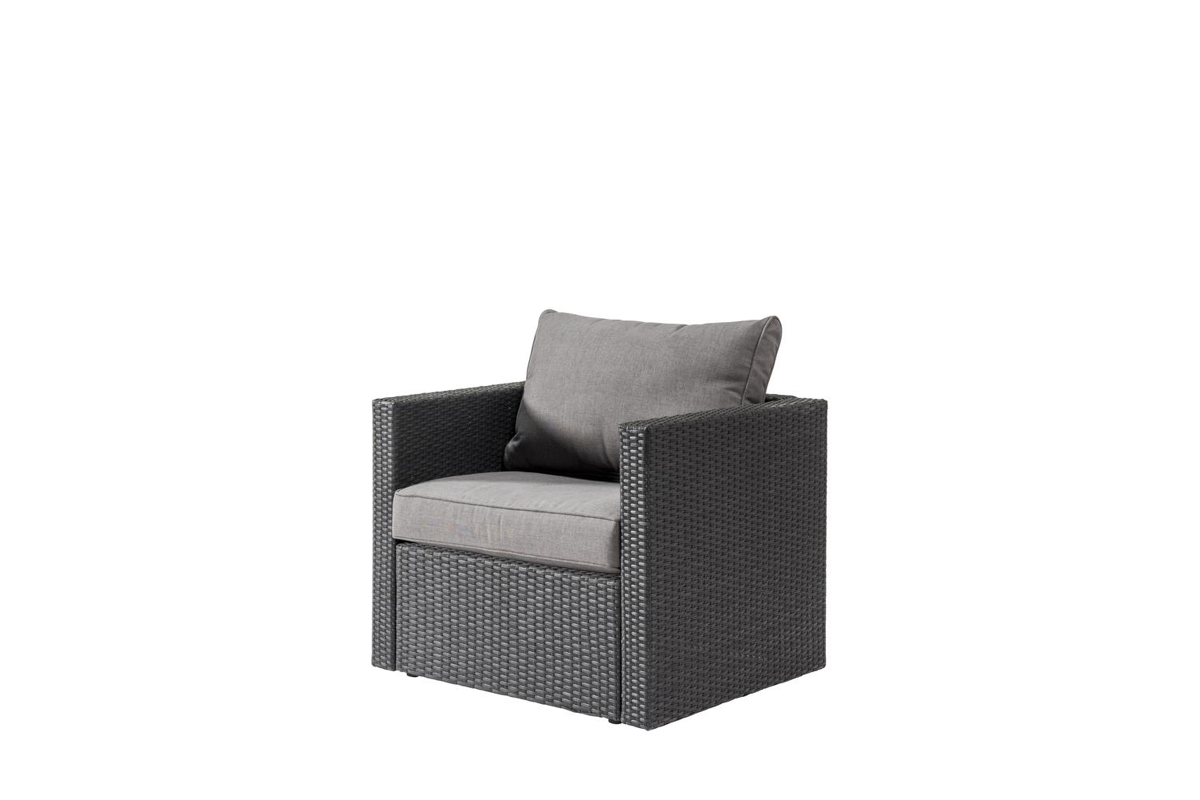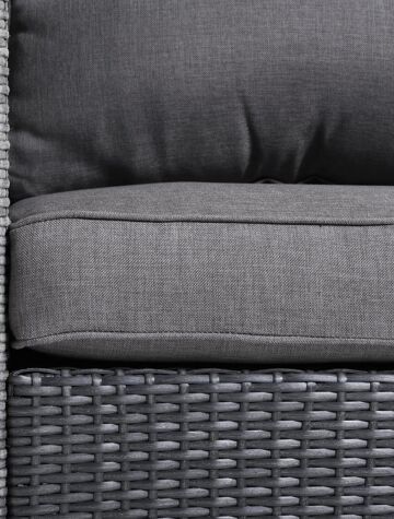 Complete lounge hoekset met poef in weerbestendige 7 mm vlakke wicker. Kleur: zwart. Inclusief grijze zit- en rugkussens. Afmeting hoek: B 208 x D 206 x H 63 cm. Afmeting koffietafel/poef: B 65 x D 65 x H 31/43 cm. Afmeting 1-zit: B 78 x D 72 x H 63 cm. De set is inclusief beschermhoezen