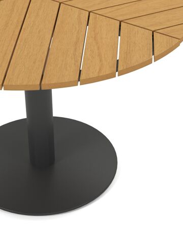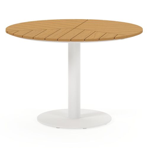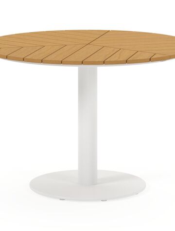 Lagos tuinset is een ronde tafel in het Vinci-assortiment met een conische stevige poot. Het tafelblad uit polywood heeft een speels patroon dat zorgt voor een warme, natuurlijk look en feel.