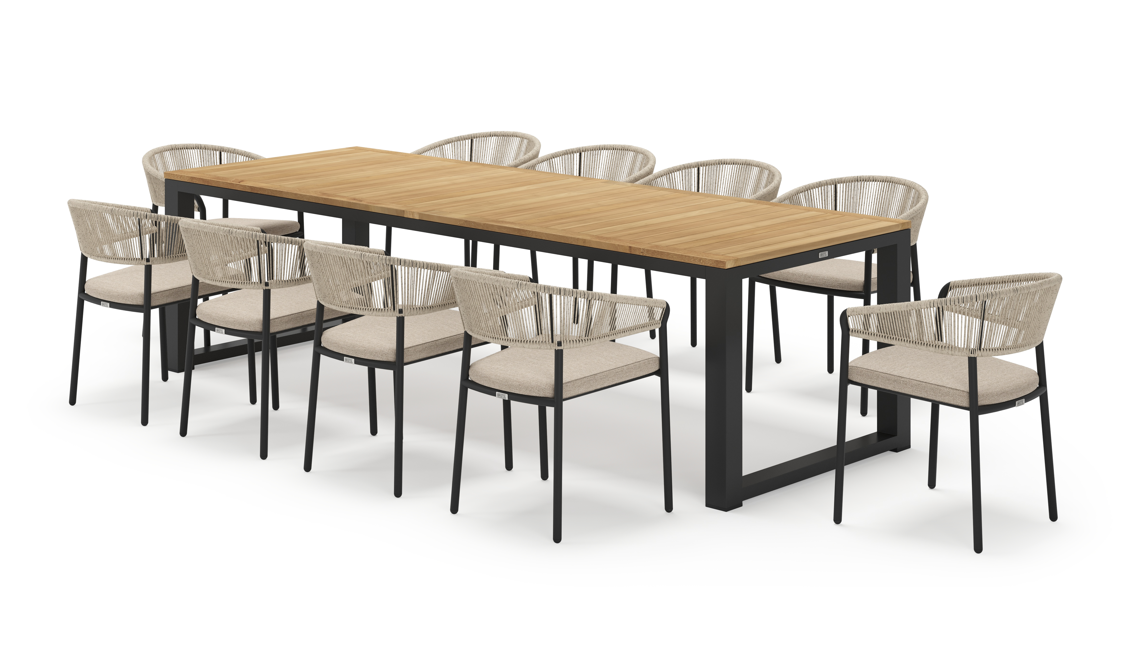 De Livo tuinset herken je onmiddellijk aan zijn kenmerkende, doorlopende tafelpoot aan weerszijden. Het levert zo een uniek design op en straalt stevigheid uit.