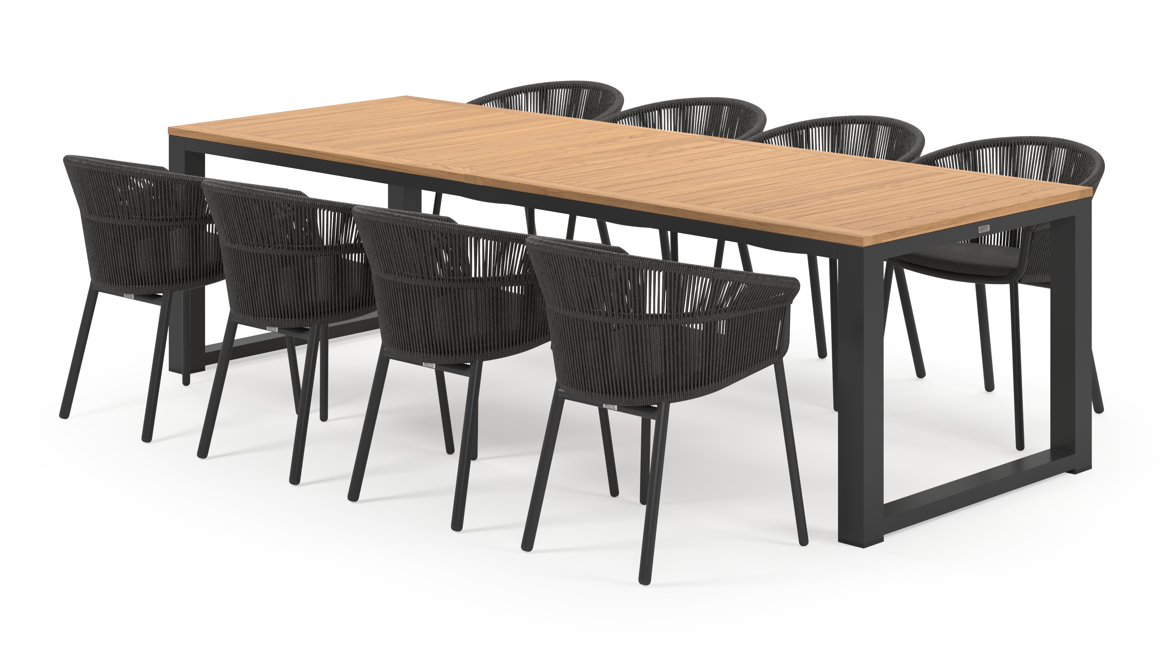 De Livo tuinset herken je onmiddellijk aan zijn kenmerkende, doorlopende tafelpoot aan weerszijden. Het levert zo een uniek design op en straalt stevigheid uit.