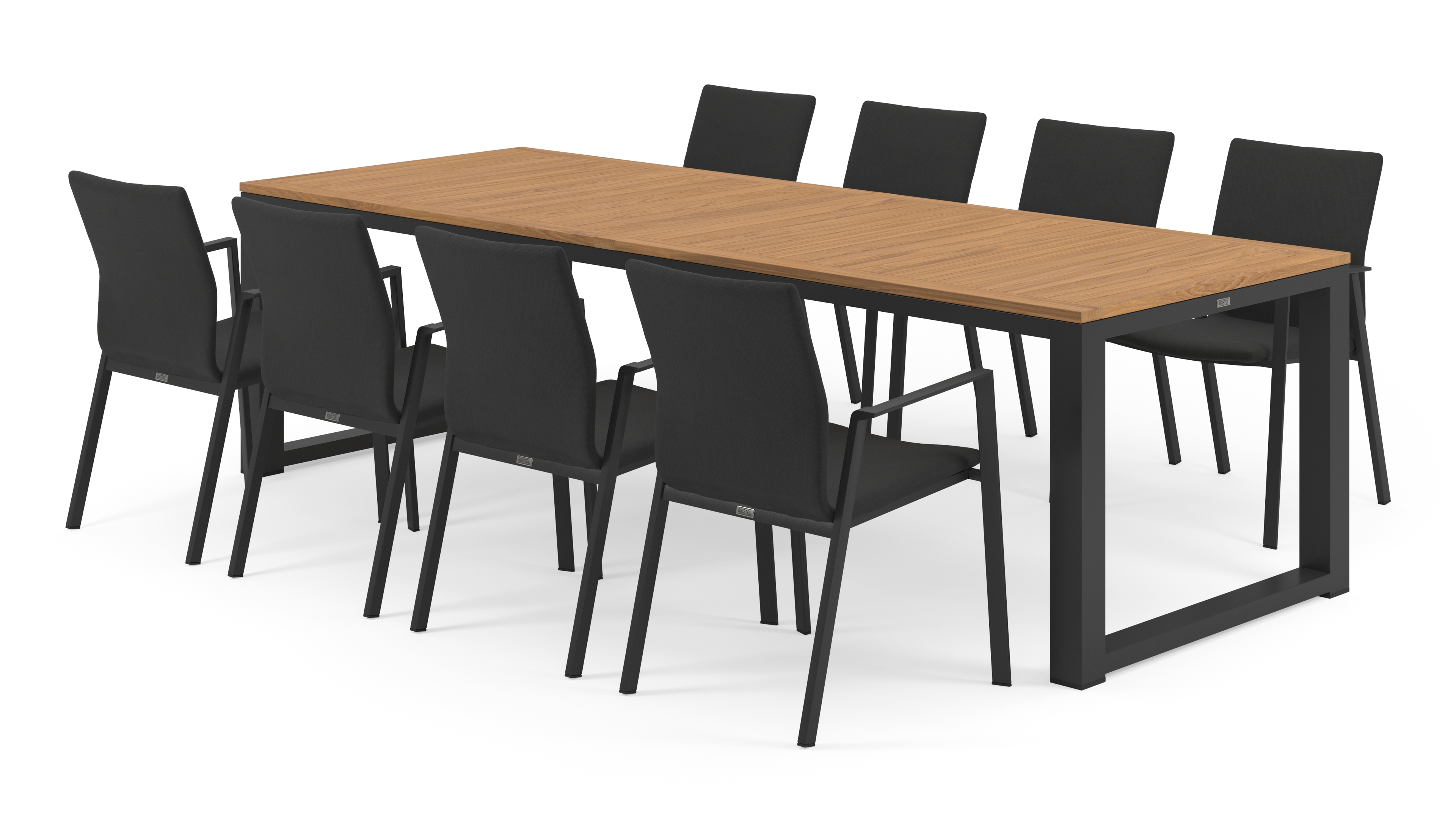 Livo tuinset in zwart aluminium en naturel teak tafelblad met 8 stapelbare Madura tuinstoelen | Exterioo tuinmeubelen