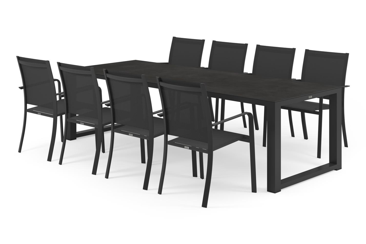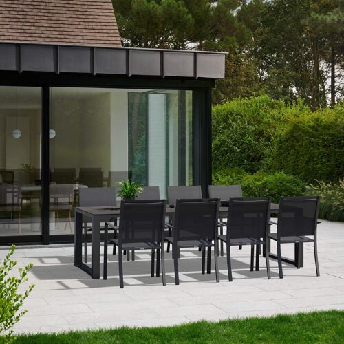 Livo tuinset in zwart aluminium en zwart volkeramiek tafelblad met 8 stapelbare Calobra tuinstoelen | Exterioo