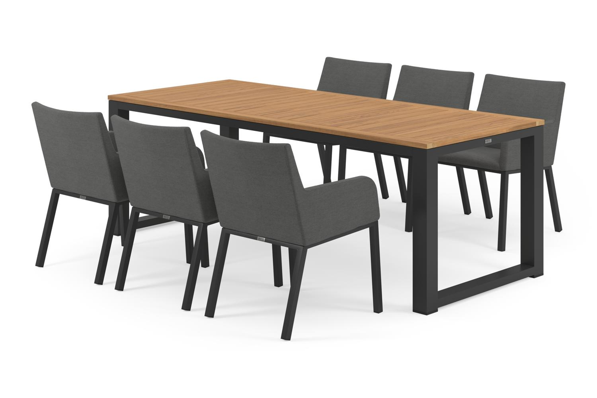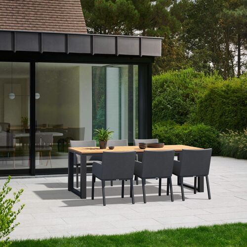 Livo tuinset herken je onmiddellijk aan zijn kenmerkende, doorlopende tafelpoot aan weerszijden. Het levert zo een uniek design op en straalt stevigheid uit.
