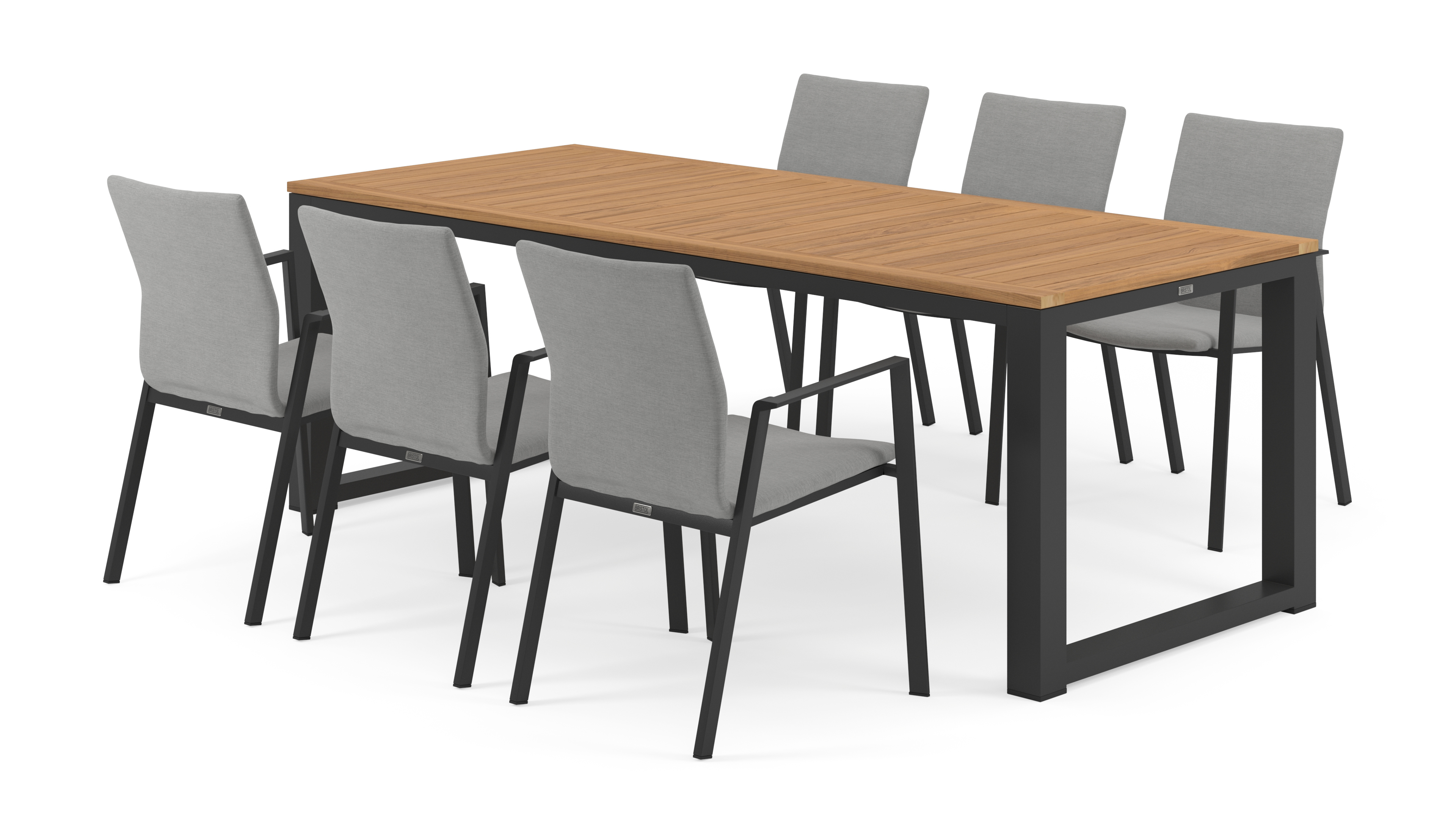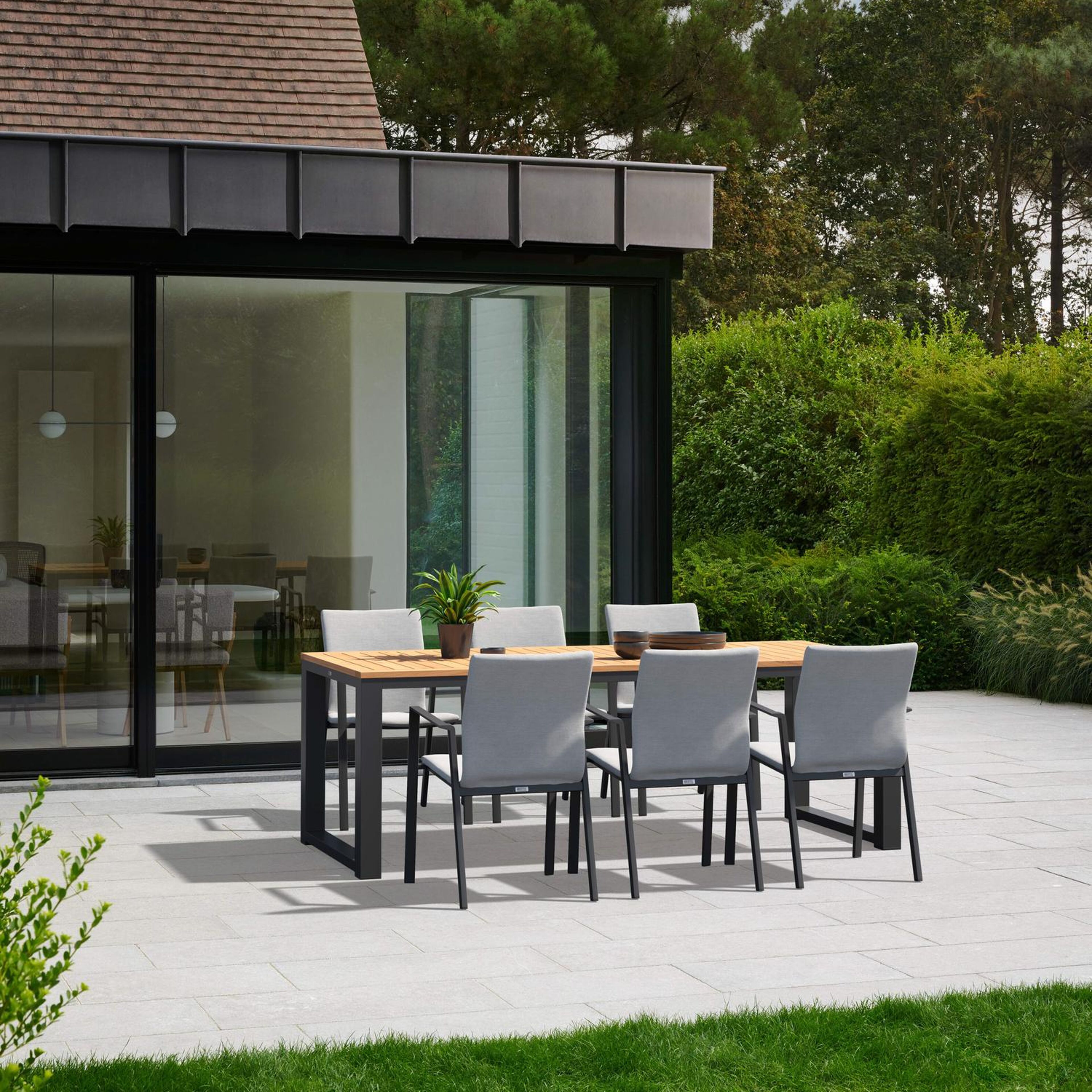 Livo tuinset herken je onmiddellijk aan zijn kenmerkende, doorlopende tafelpoot aan weerszijden. Het levert zo een uniek design op en straalt stevigheid uit.