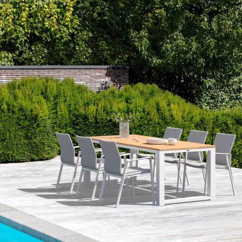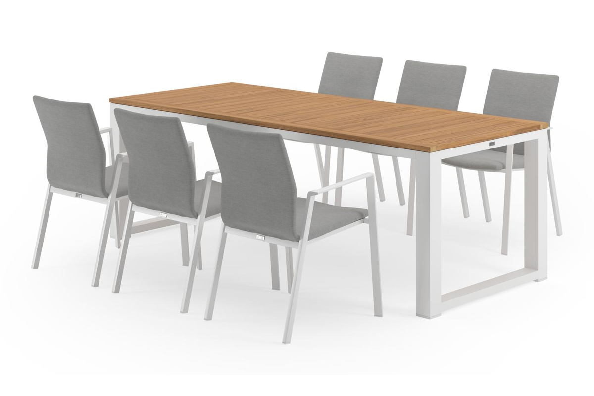 Livo tuinset herken je onmiddellijk aan zijn kenmerkende, doorlopende tafelpoot aan weerszijden. Het levert zo een uniek design op en straalt stevigheid uit.