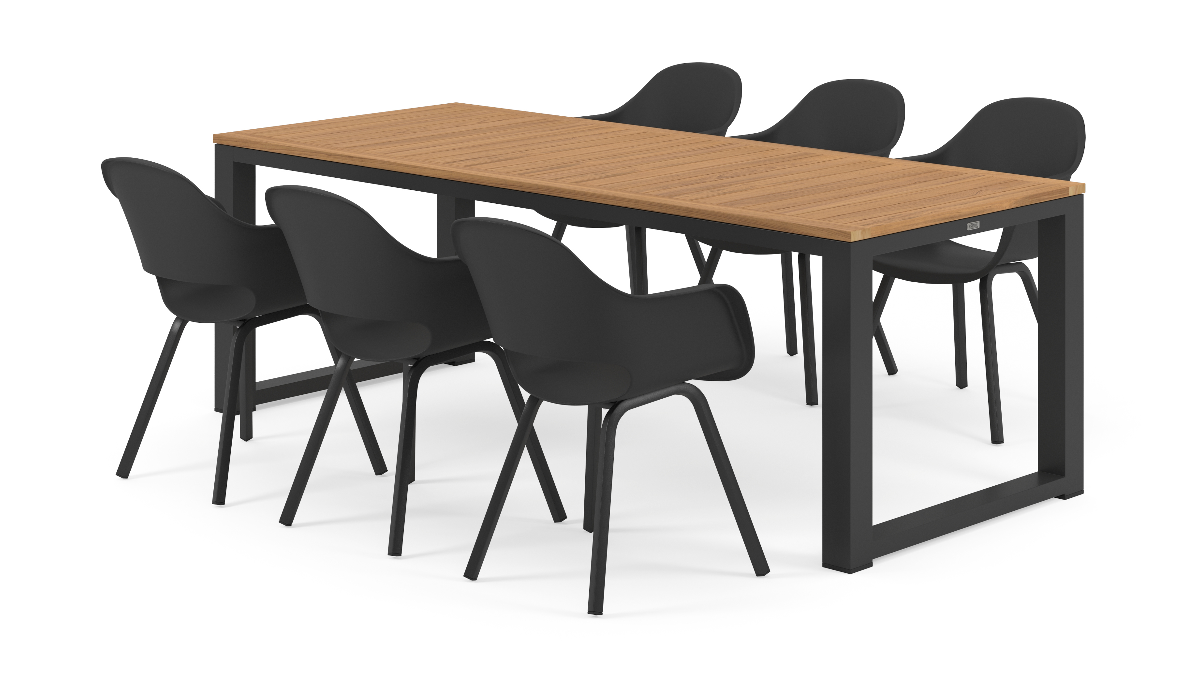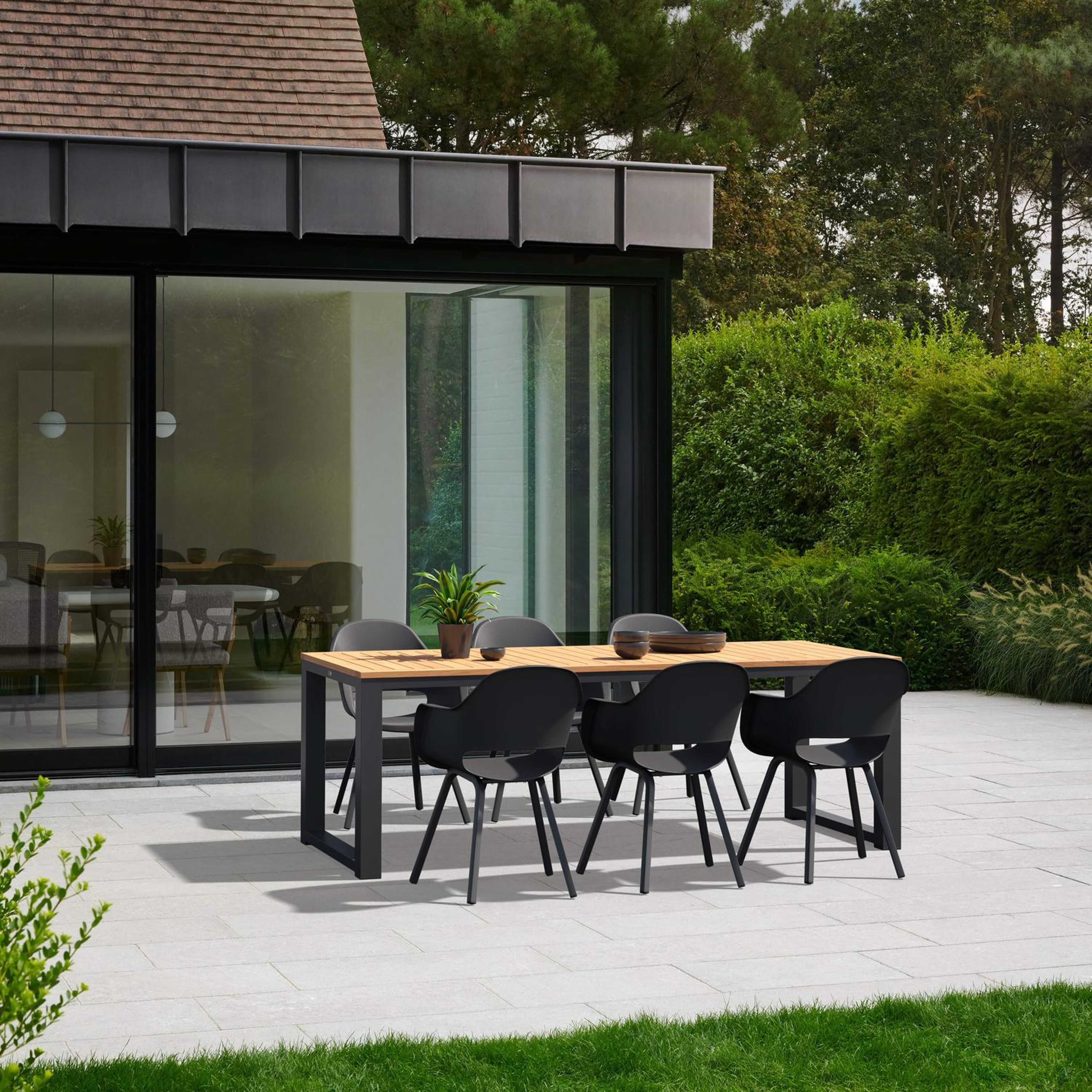 Livo tuinset herken je onmiddellijk aan zijn kenmerkende, doorlopende tafelpoot aan weerszijden. Het levert zo een uniek design op en straalt stevigheid uit.