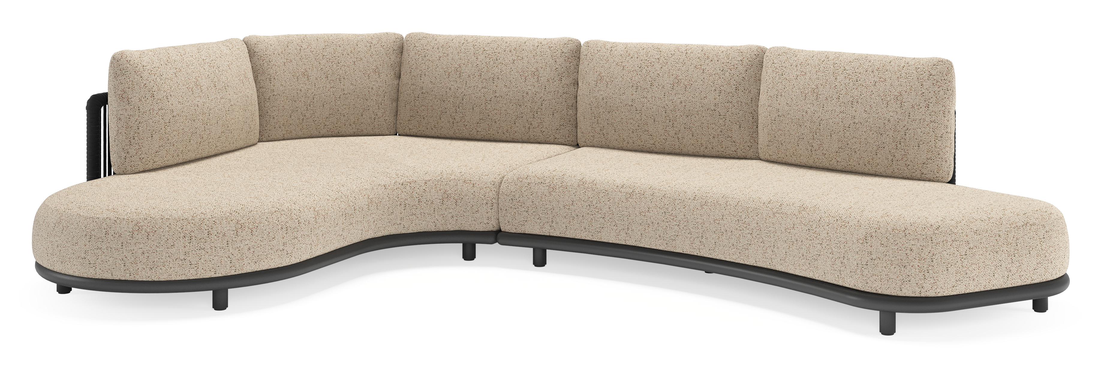 Lomano loungehoek in zwart aluminium en zwart verticaal geweven luxe vlakke rope met bora jungle all weather cosytica kussen | Exterioo tuinmeubelen