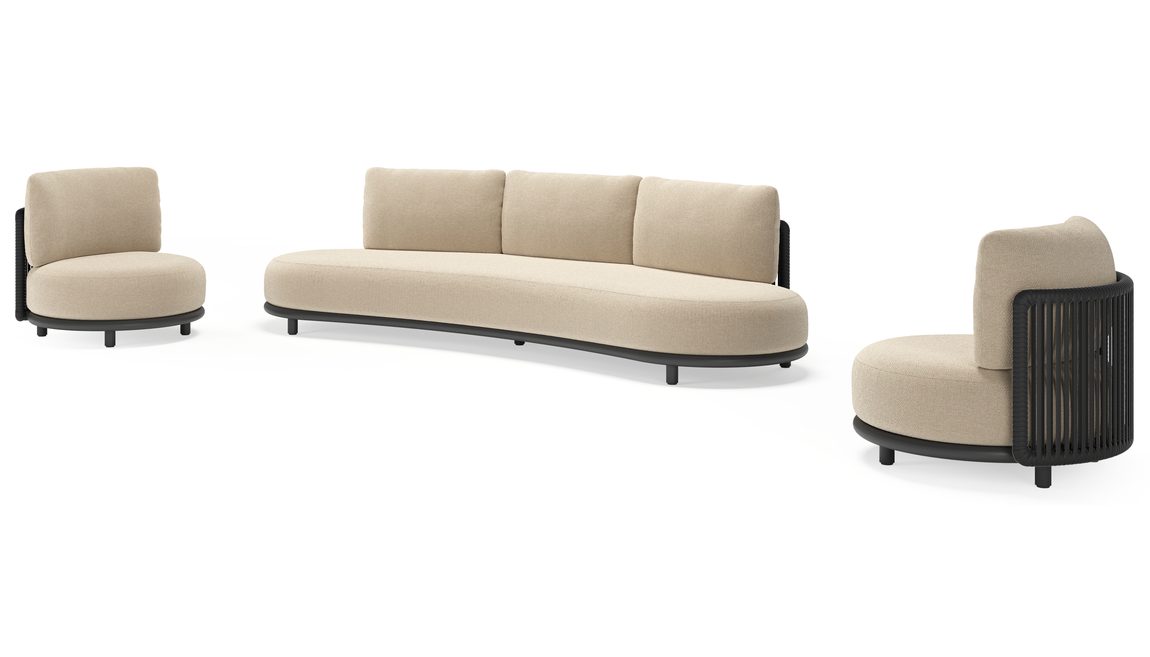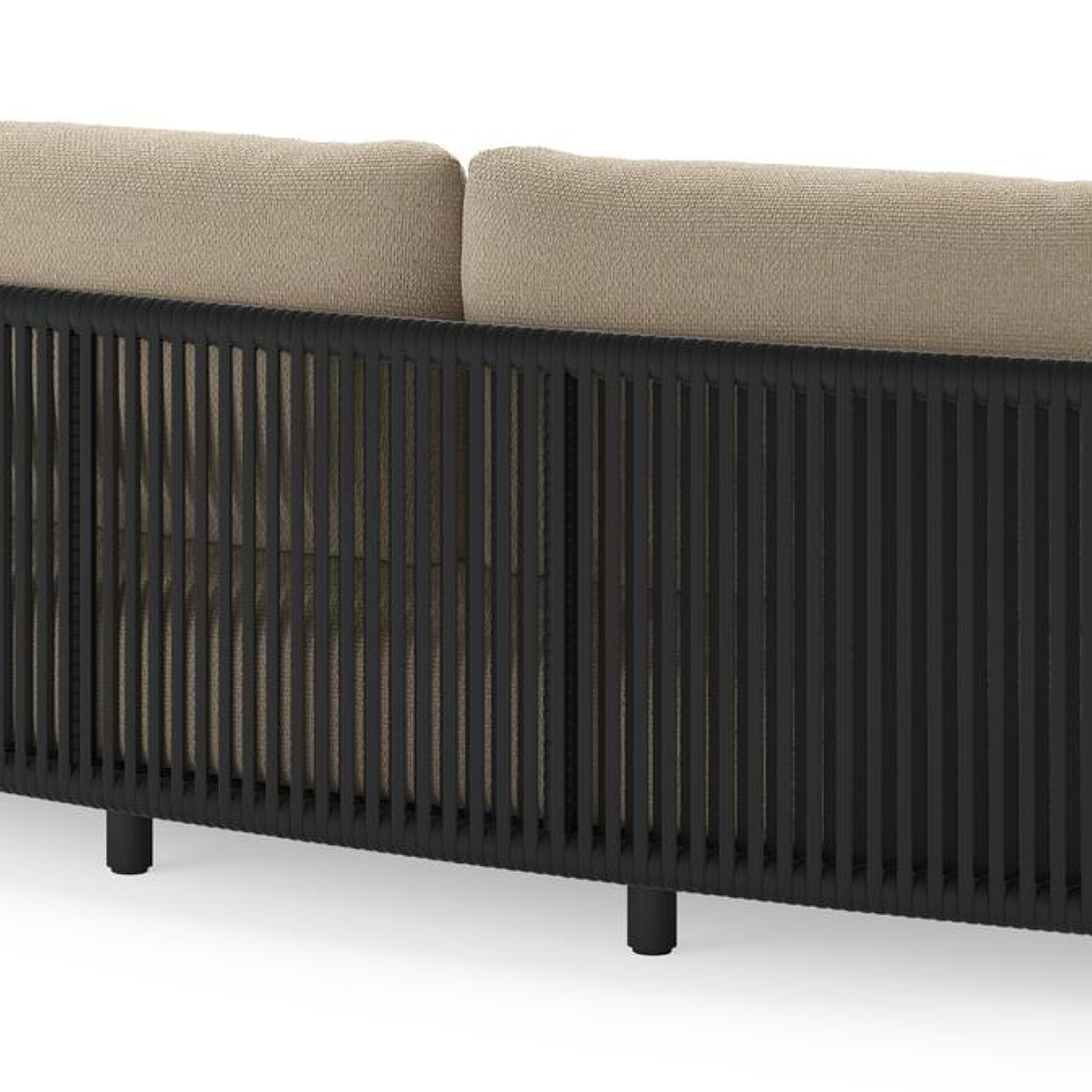 Lomano loungeset in zwart aluminium en zwart verticaal geweven luxe vlakke rope met althea chalk all weather cosytica kussen | Exterioo tuinmeubelen