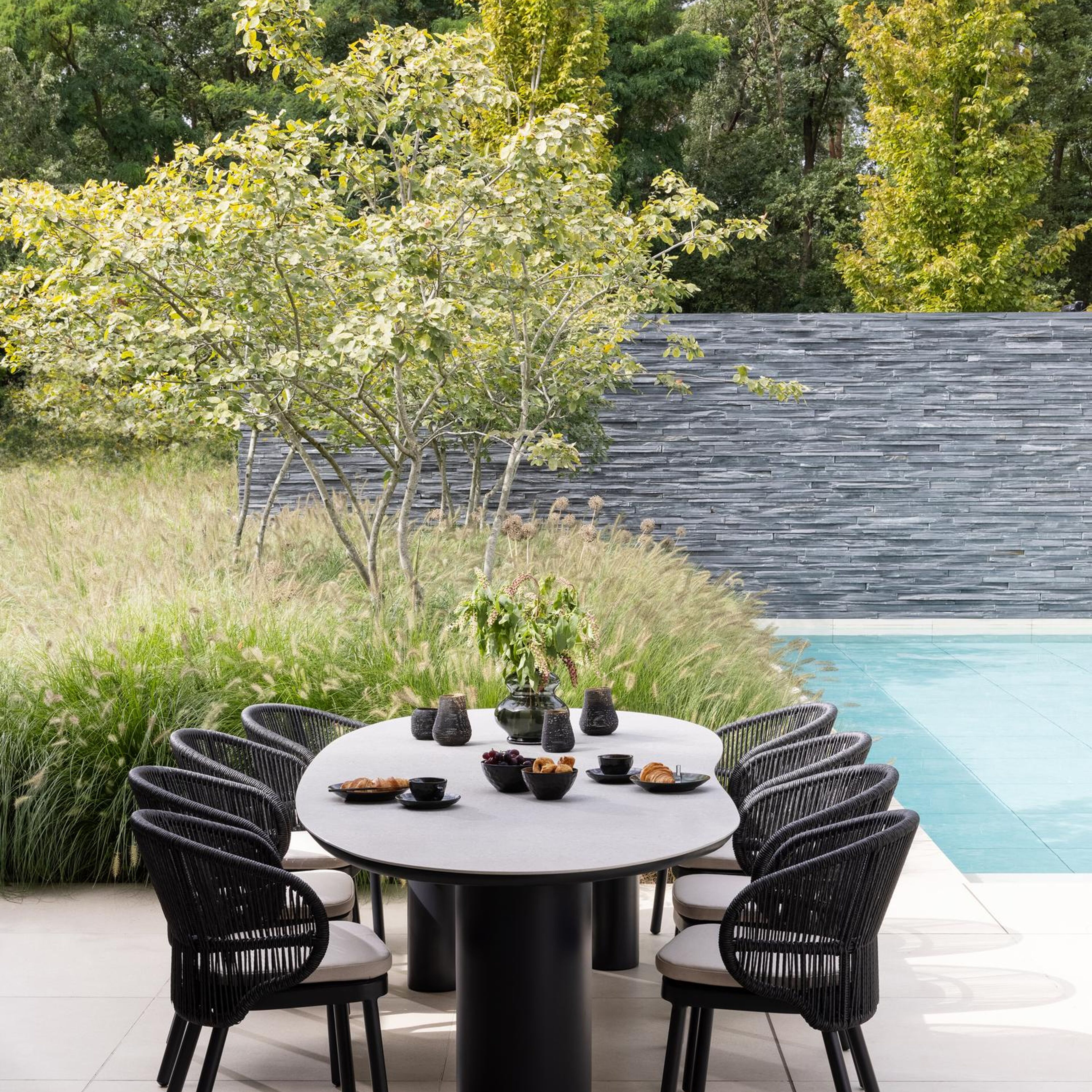 De Lugano tuinstoel straalt tijdloze en gevleugelde elegantie uit met zijn minimalistische design en zachte afgeronde vormen.
