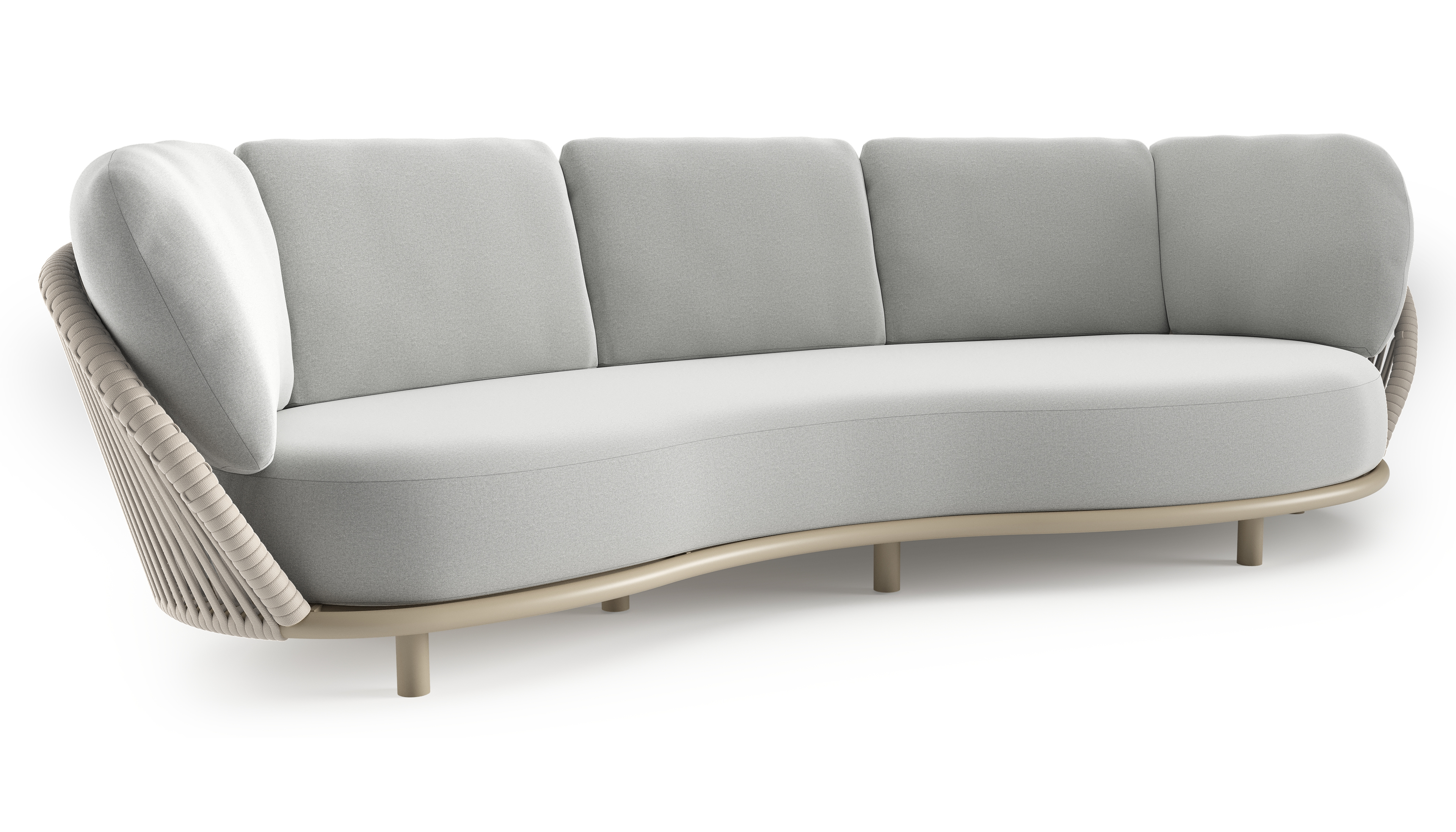 Lupino loungebank in beige aluminium en beige verticaal geweven luxe vlakke brede rope met natte grey chine all weather sunbrella® luxe kussen | Exterioo tuinmeubelen