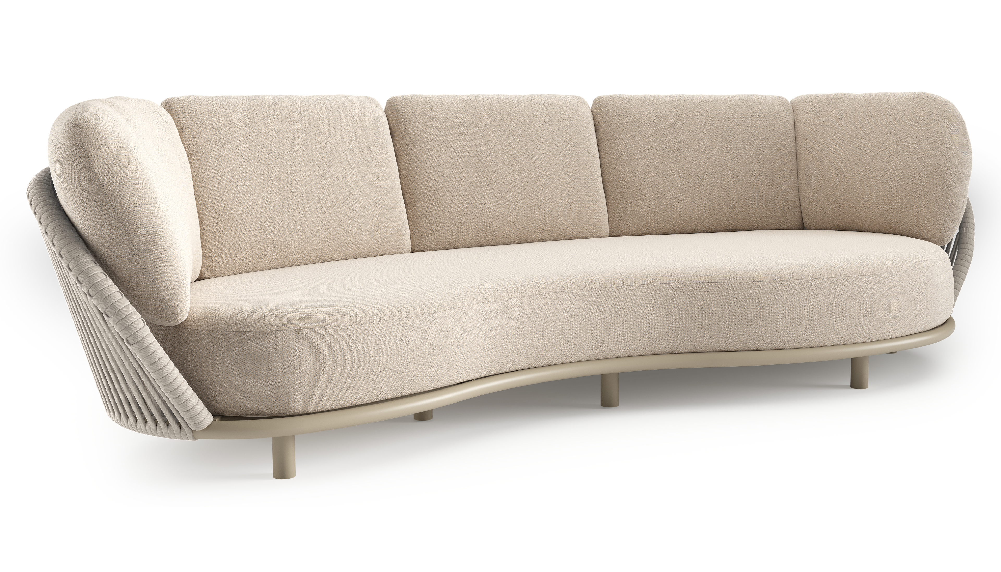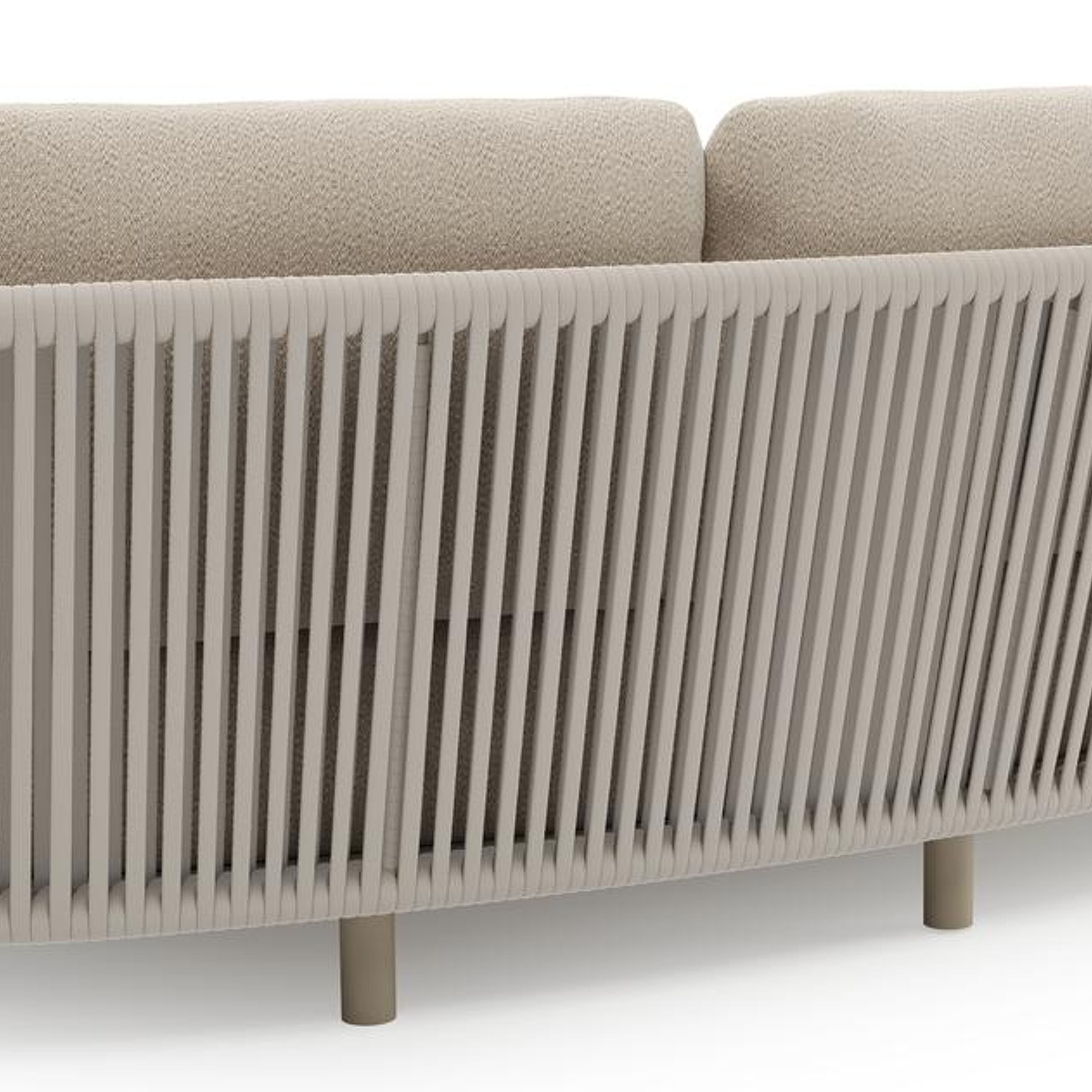 Lupino loungebank in beige aluminium en beige verticaal geweven luxe vlakke brede rope met lopi sand all weather sunbrella® luxe kussen | Exterioo tuinmeubelen