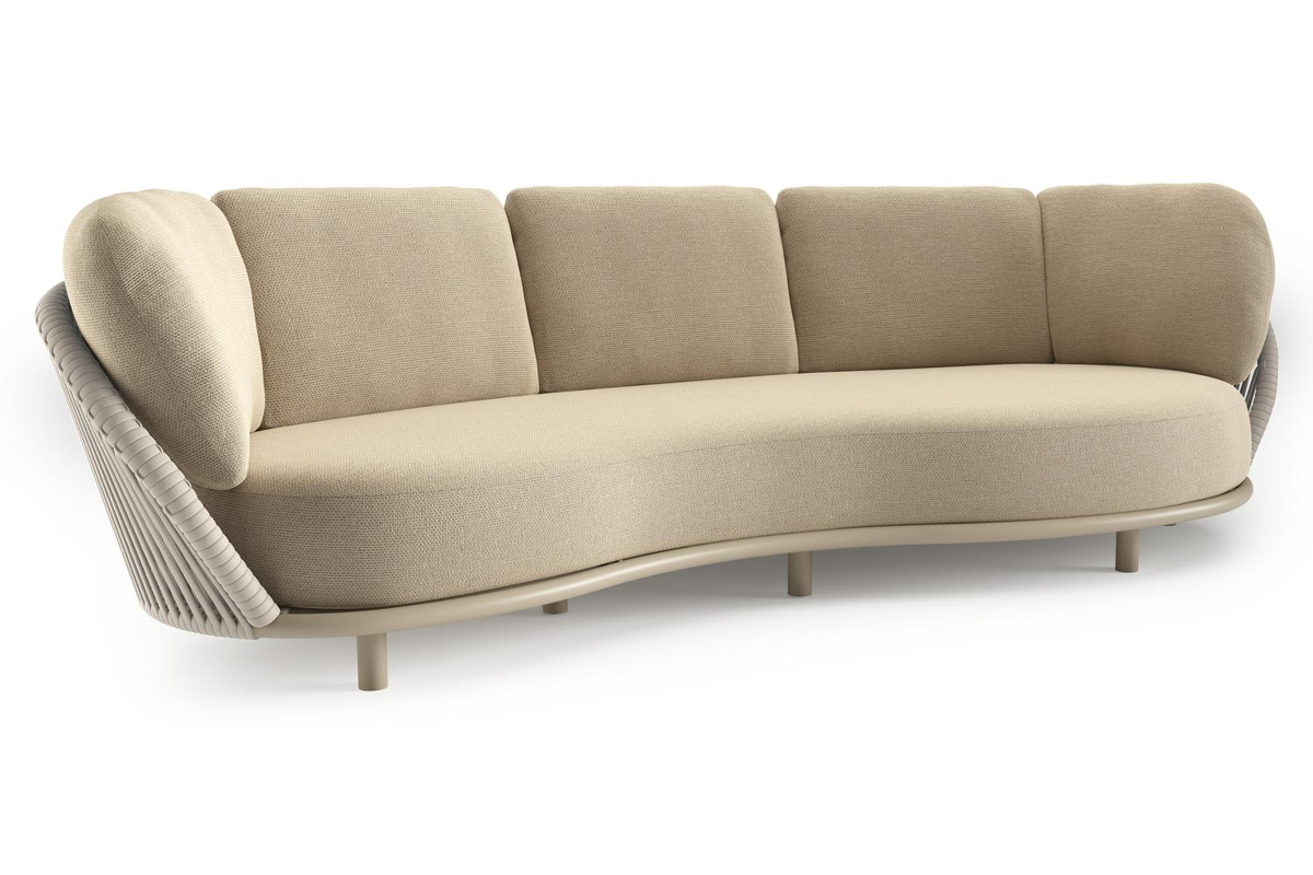 Lupino loungebank in beige aluminium en beige verticaal geweven luxe vlakke brede rope met althea camel all weather cosytica kussen | Exterioo