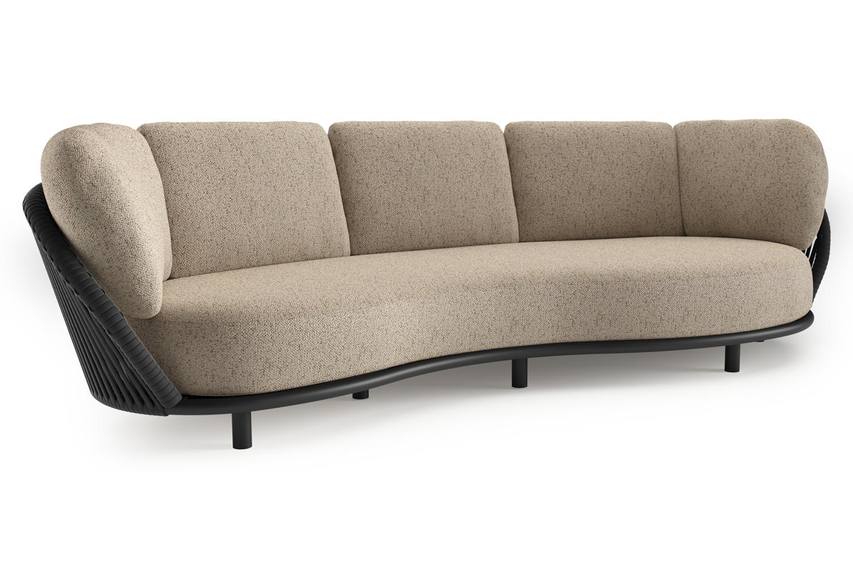 Lupino loungebank in zwart aluminium en zwart verticaal geweven luxe vlakke brede rope met bora jungle all weather cosytica kussen | Exterioo