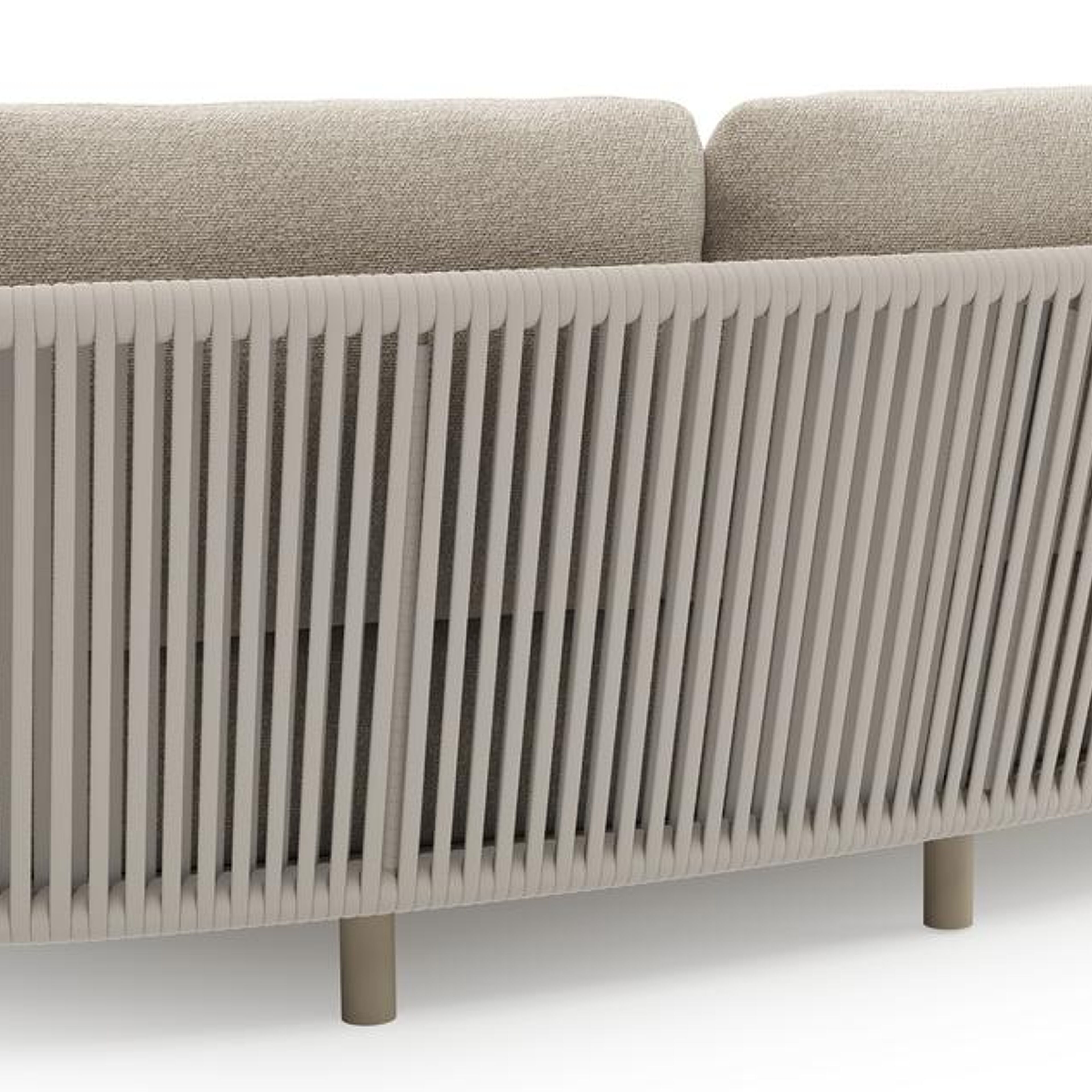 Lupino loungeset in beige aluminium en beige verticaal geweven luxe vlakke brede rope met marbella ecru all weather cosytica kussen | Exterioo tuinmeubelen