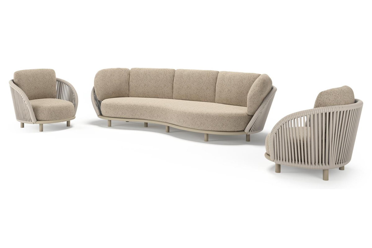 Lupino loungeset in beige aluminium en beige verticaal geweven luxe vlakke brede rope met bora jungle all weather cosytica kussen | Exterioo