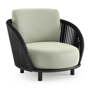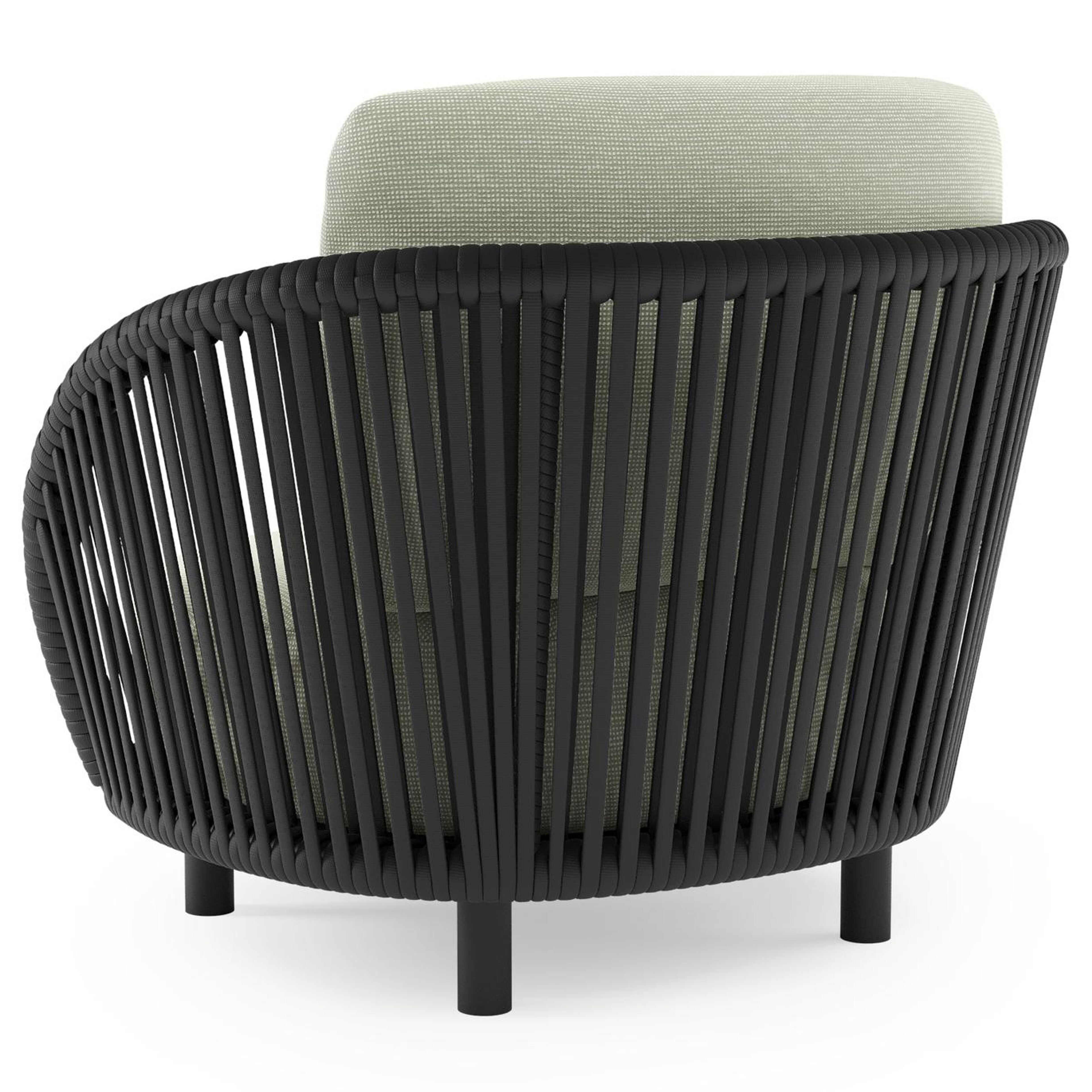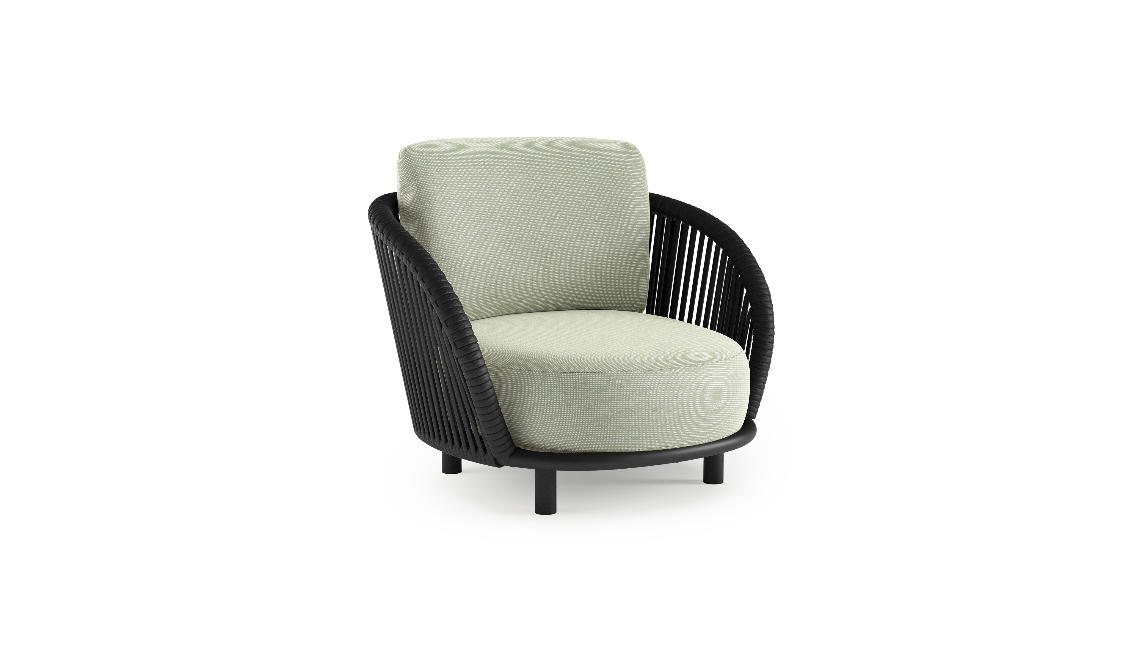 Lupino loungestoel in zwart aluminium en zwart verticaal geweven luxe vlakke brede rope met slow spirea all weather sunbrella® luxe kussen | Exterioo tuinmeubelen