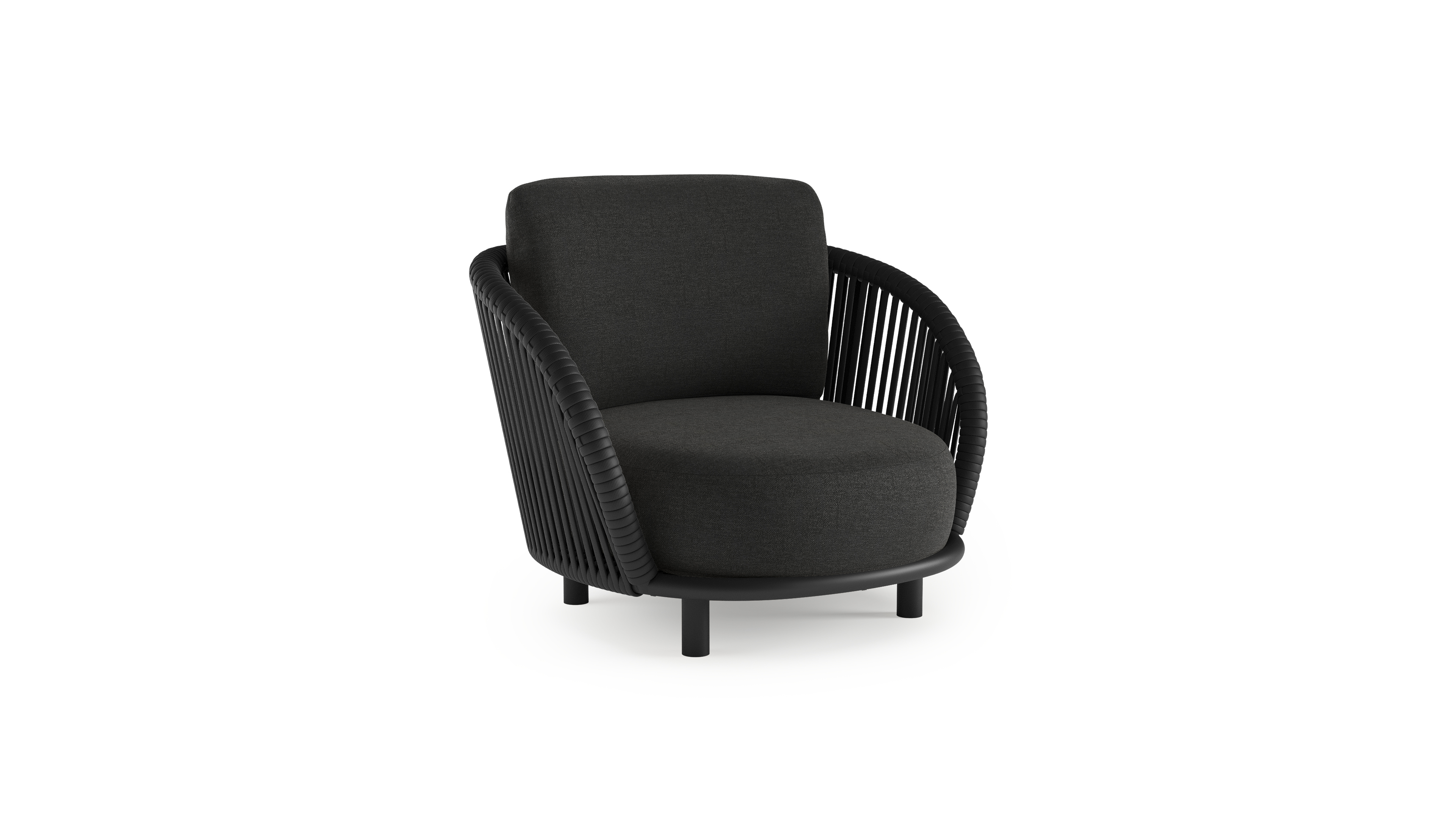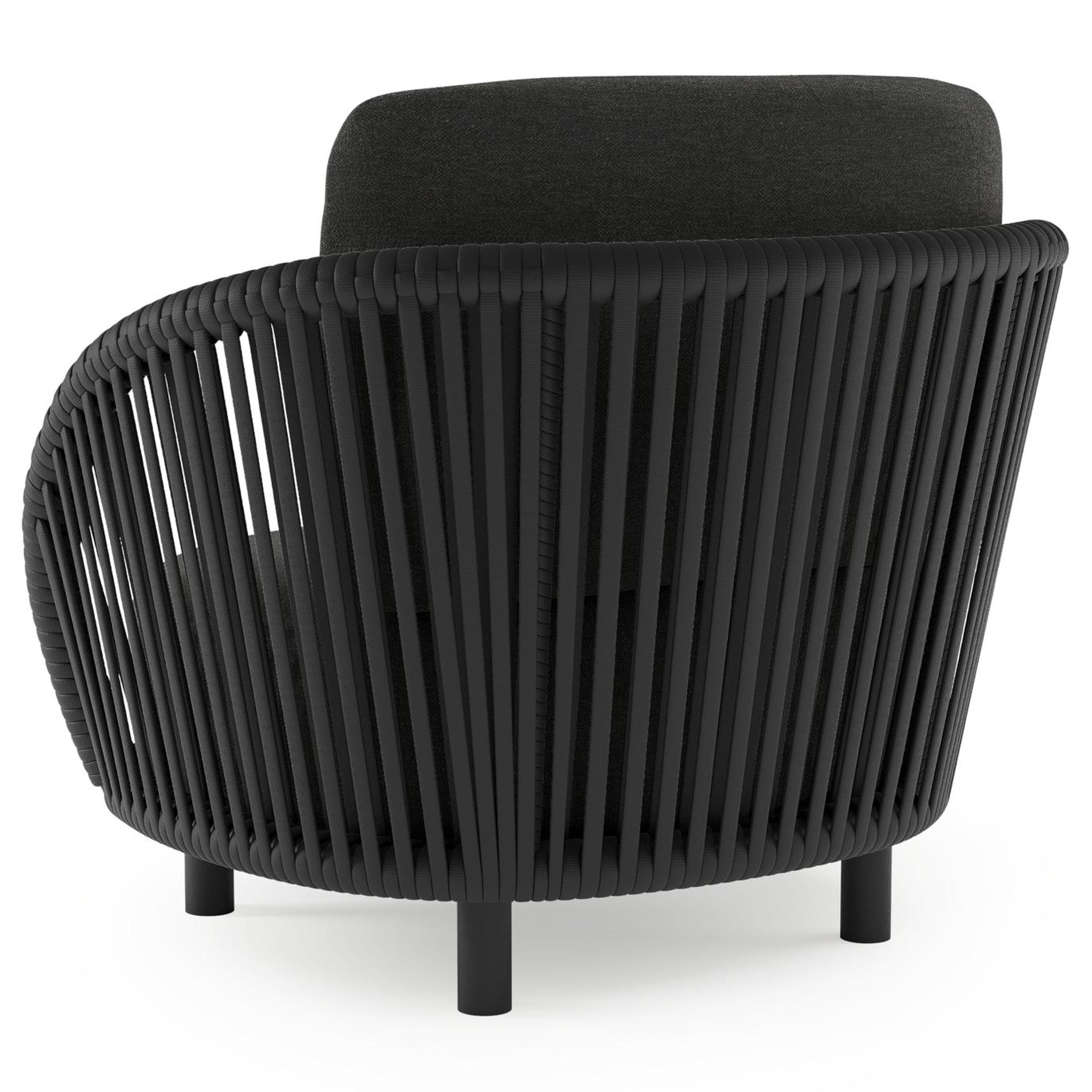 Lupino loungestoel in zwart aluminium en zwart verticaal geweven luxe vlakke brede rope met chartres sooty all weather sunbrella® luxe kussen | Exterioo tuinmeubelen