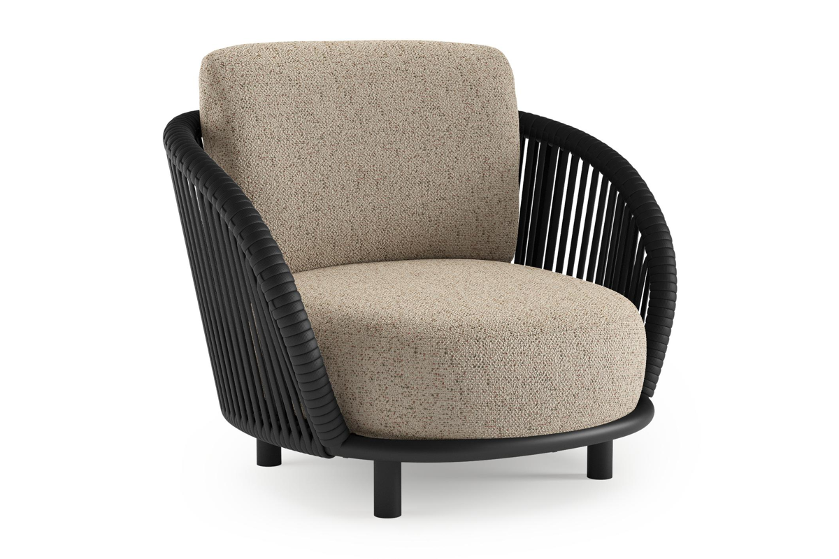 Lupino loungestoel in zwart aluminium en zwart verticaal geweven luxe vlakke brede rope met bora jungle all weather cosytica kussen | Exterioo