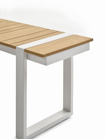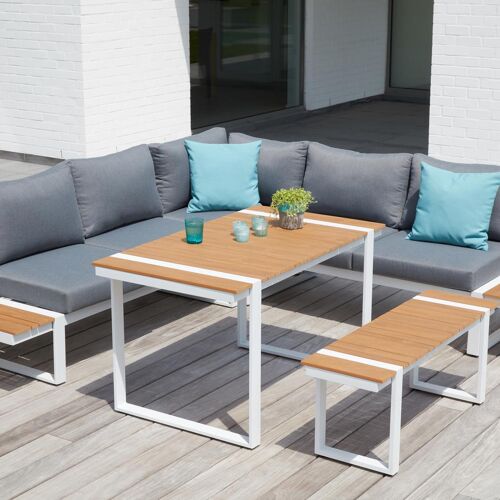 De loungetafel is inbegrepen in de loungeset en gemaakt uit een onderstel van roestvrij aluminium. De afwerking van het tafelblad bestaat uit polywood.