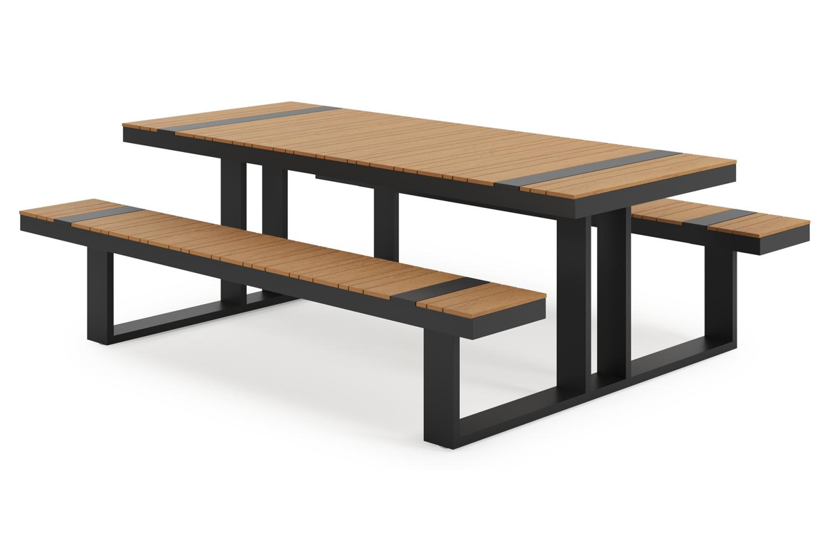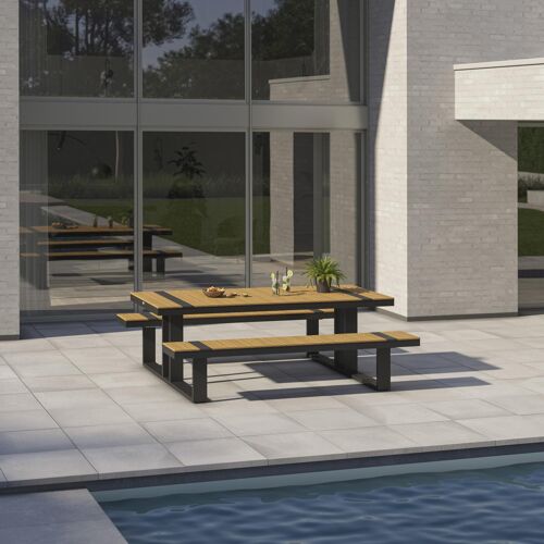 Merida picknicktafel is een collectie met een modern design en mooie afwerking in het tafelblad. De tafelpoot is namelijk geïntegreerd in de zijden van het tafelblad en loopt door onder het frame van de tafel.