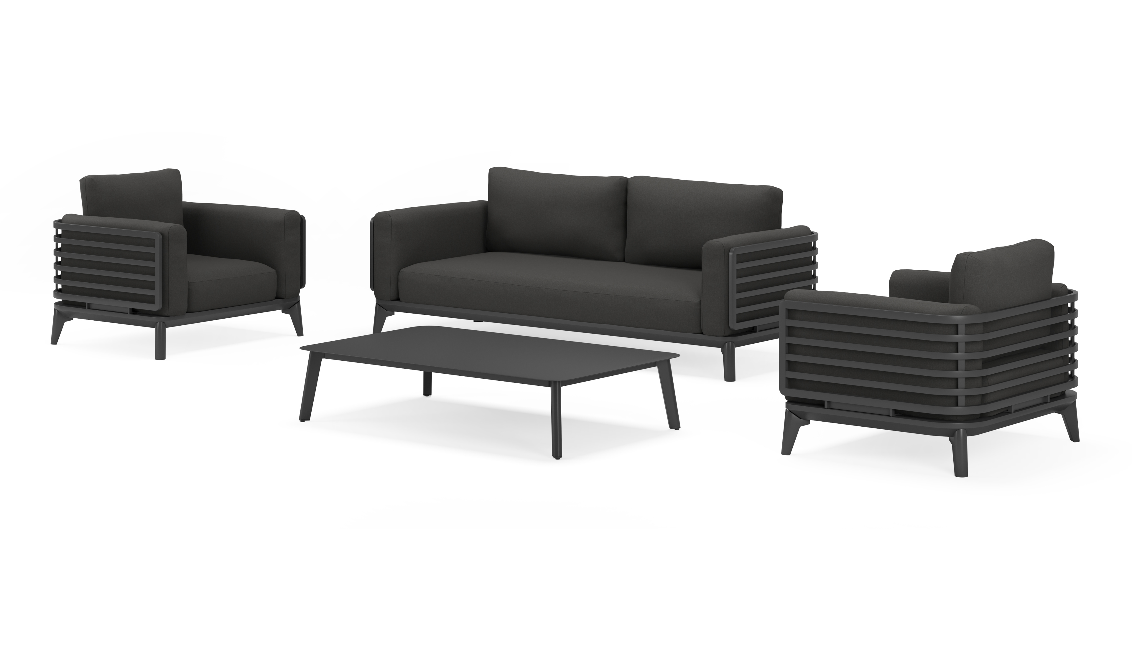 De loungetafel is inbegrepen en volledig gemaakt uit roestvrij aluminium.