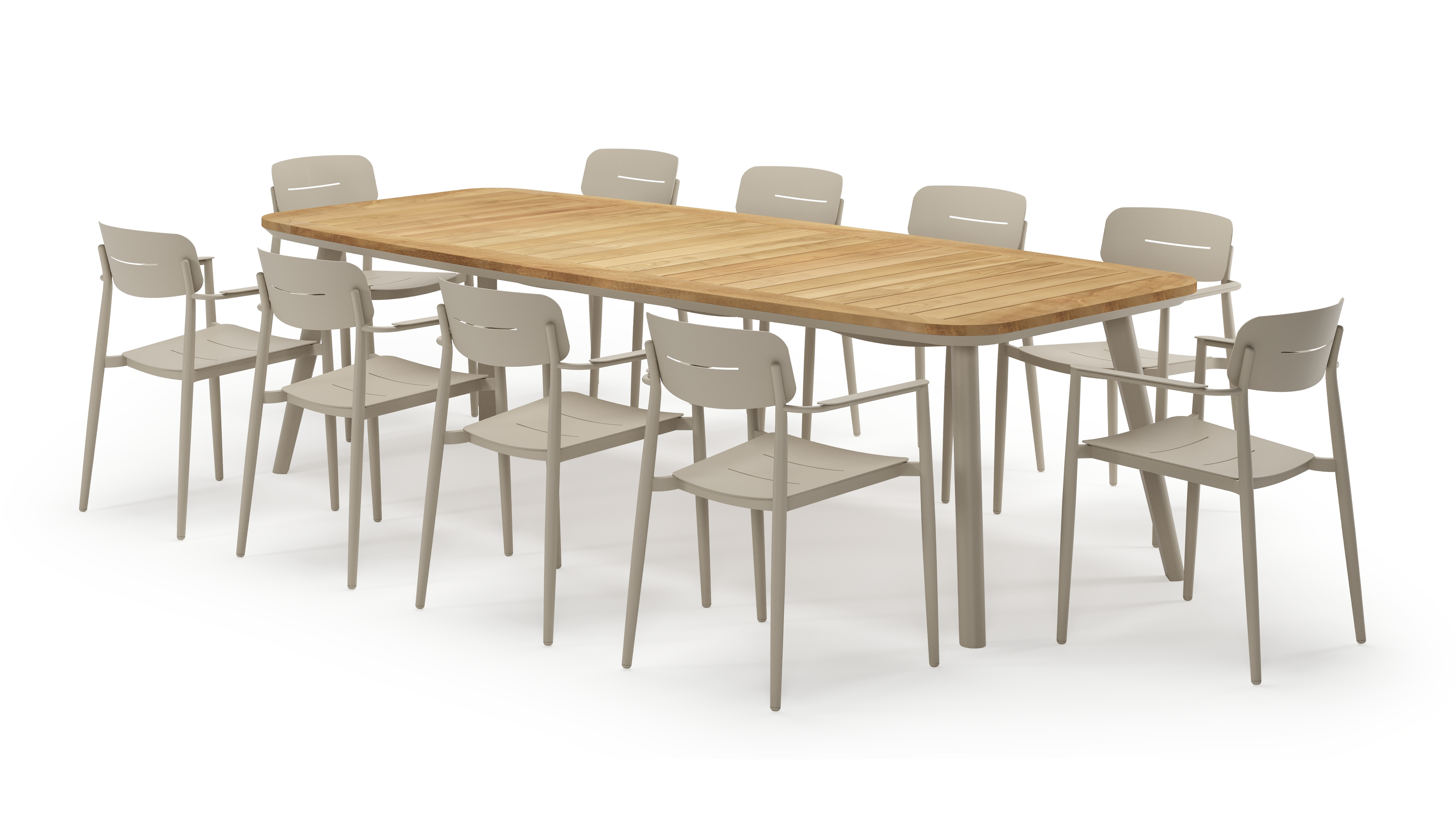 De Mosa tuinset herken je makkelijk aan het afgerond rechthoekig tafelblad en de naar buiten afgeschuinde poten. De tafel heeft een moderne look met een elegante touch.