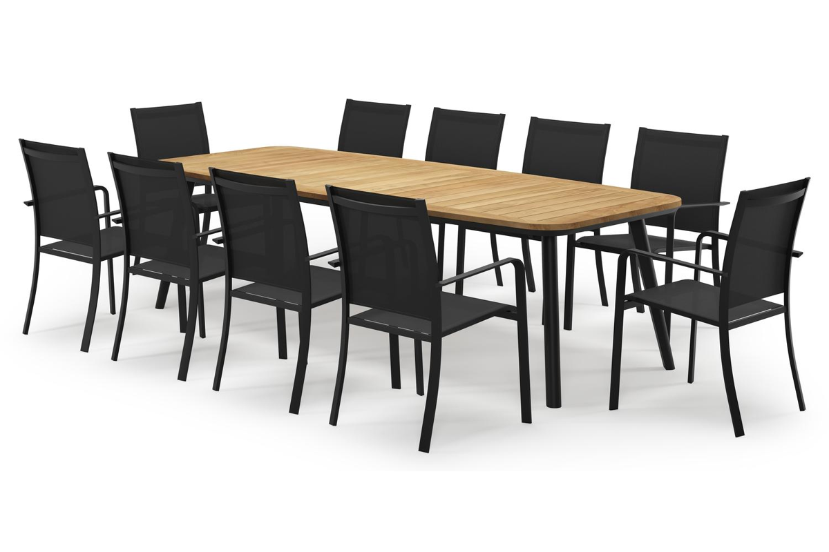 De Mosa tuinset herken je makkelijk aan het afgerond rechthoekig tafelblad en de naar buiten afgeschuinde poten. De tafel heeft een moderne look met een elegante touch.