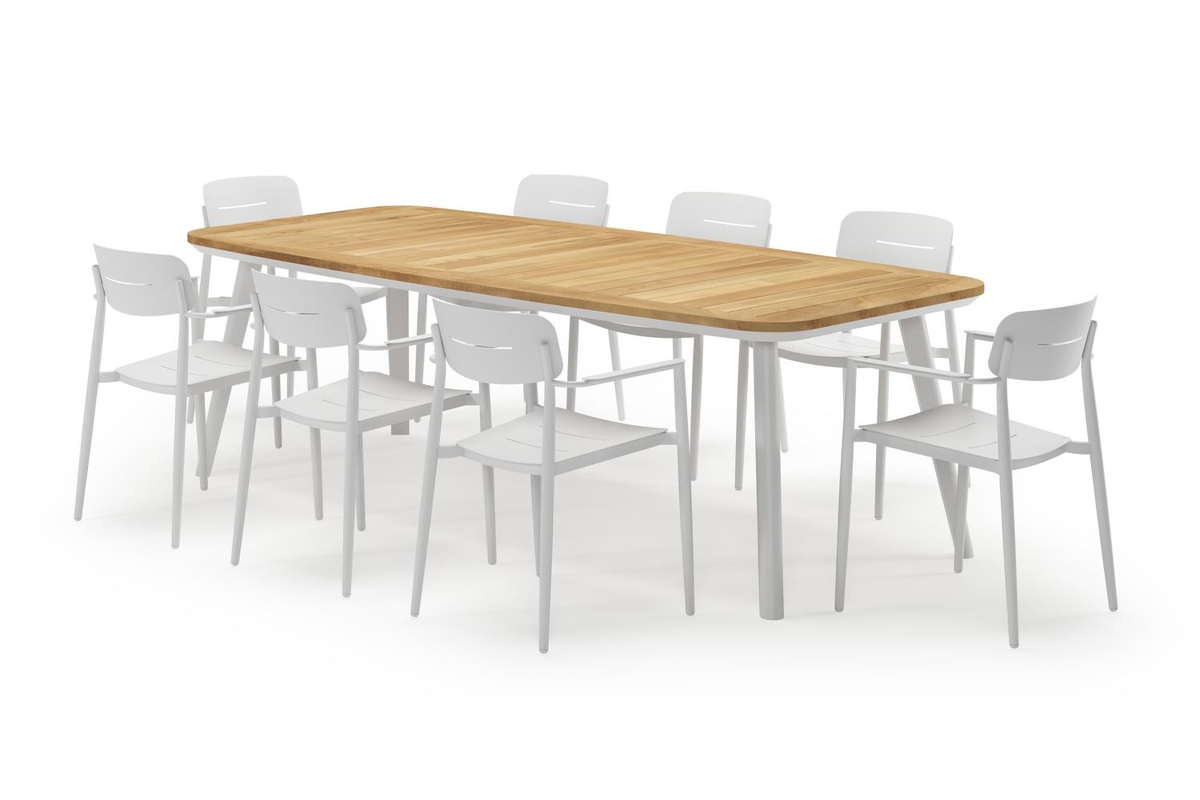 Mosa bootvormige tuinset in wit aluminium en teak natural finish met 8 Cosa tuinstoelen | Exterioo