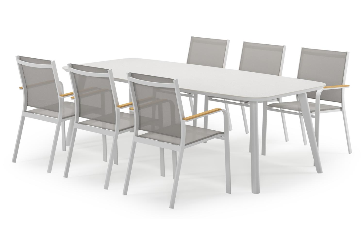 Mosa bootvormige tuinset in wit aluminium en sintered stone topo minerale met 6 Amalfi tuinstoelen | Exterioo