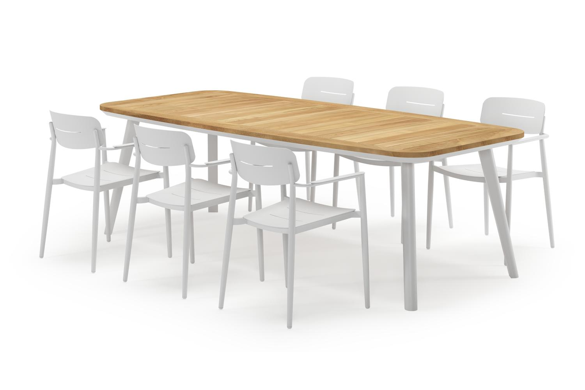 De Mosa tuinset herken je makkelijk aan het afgerond rechthoekig tafelblad en de naar buiten afgeschuinde poten. De tafel heeft een moderne look met een elegante touch.