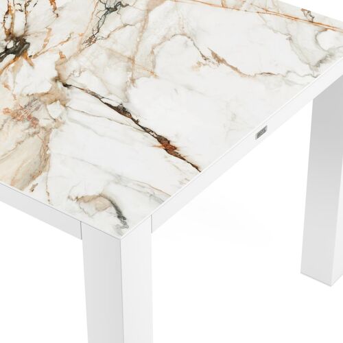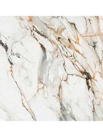 Calacatta Luxe is een echte eyecatcher met luxueuze uitstraling. De basis van het blad is wit, maar toont intense contrasten en kleurschakeringen voor een verbluffend effect. Het is afgewerkt met grijze en goudgele aders voor een prachtige marmerlook.