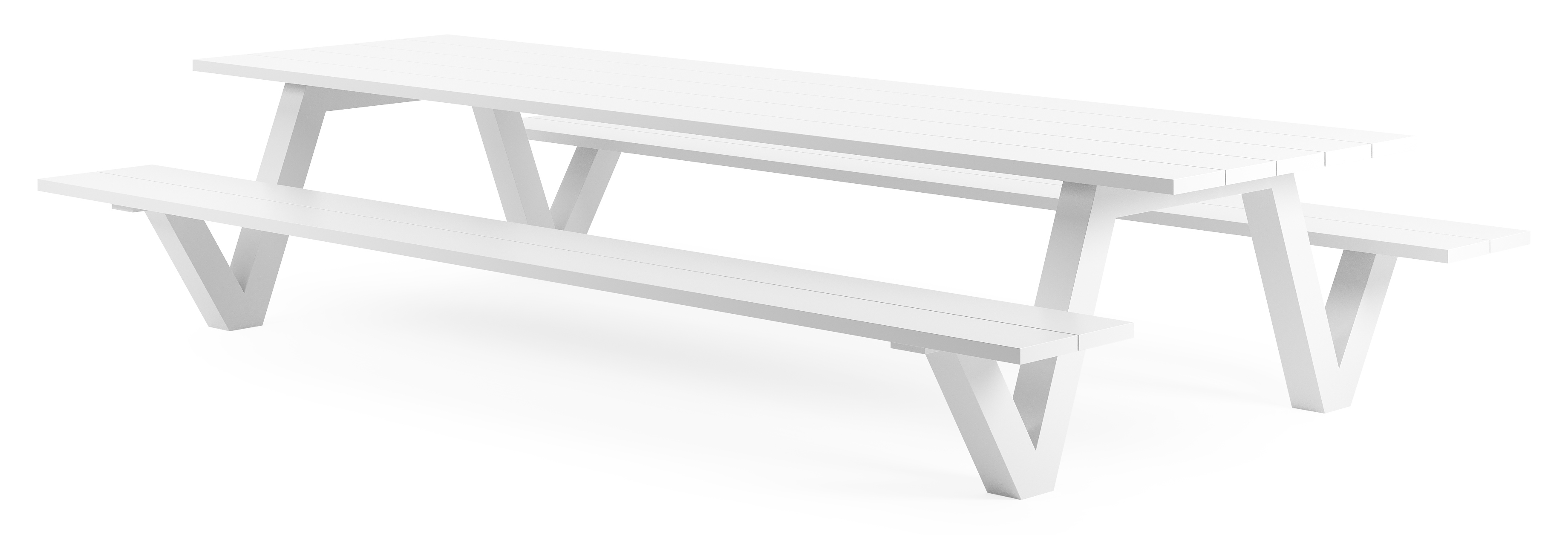 De Norma picknicktafel straalt een eigentijdse en afgelijnde look uit. De tafel is herkenbaar aan zijn gestroomlijnde v-poot onder het frame.